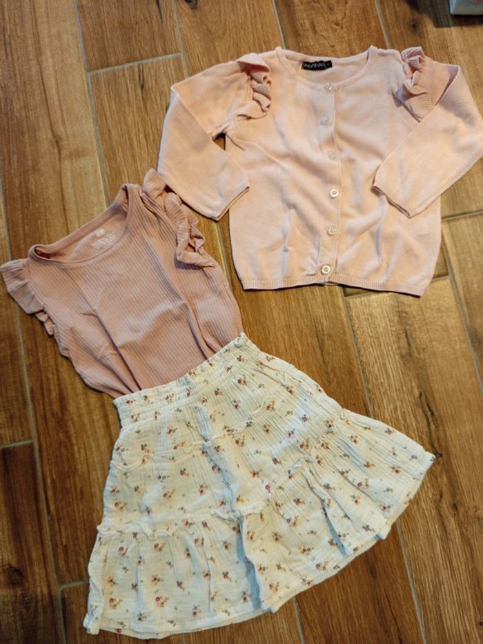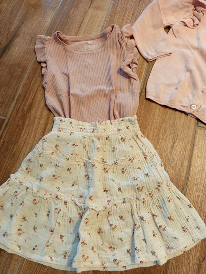 Ensemble 4 ans Jupe patineuse maille lange ,écrue imprimée liberty, smock taille , Kiabi Tee shirt rose poudré avec détail volant manches, H&M Gilet rose poudré détail volant