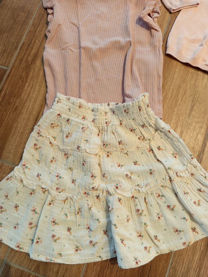Ensemble jupe écru liberty+ tee shirt rose+ gilet volants 4 ans - photo numéro 2