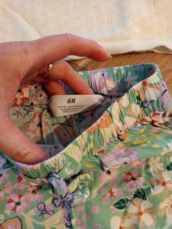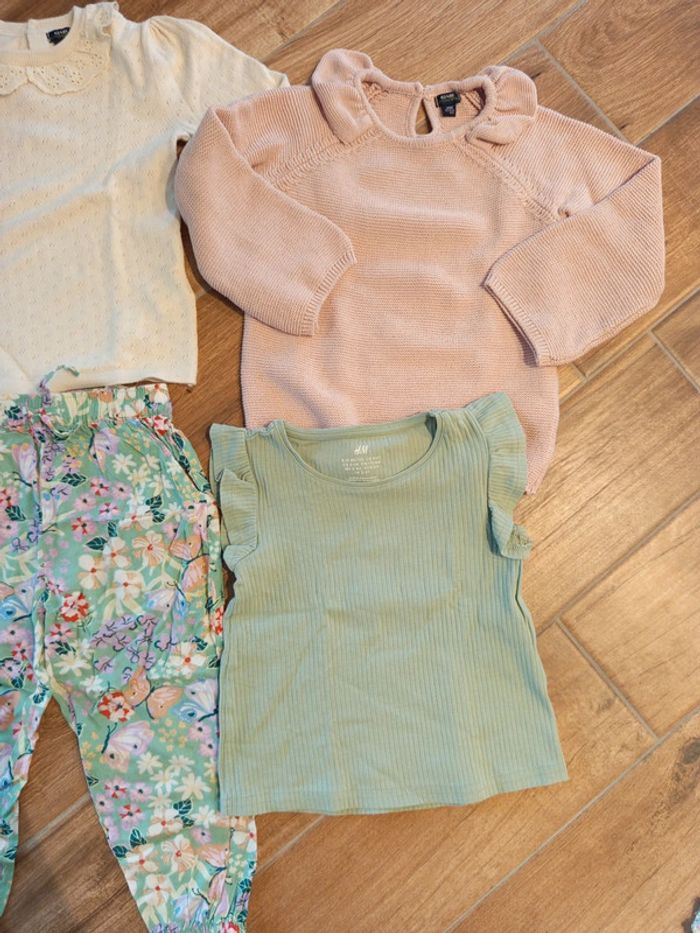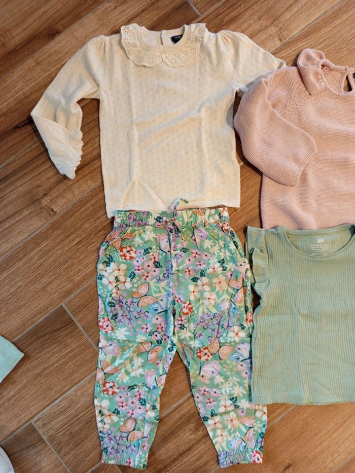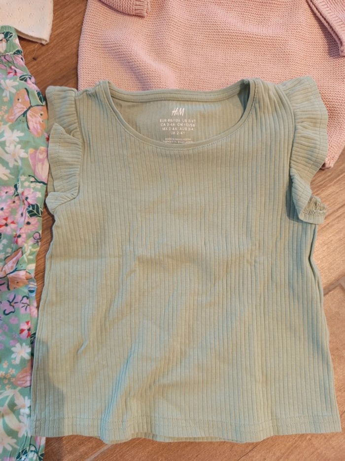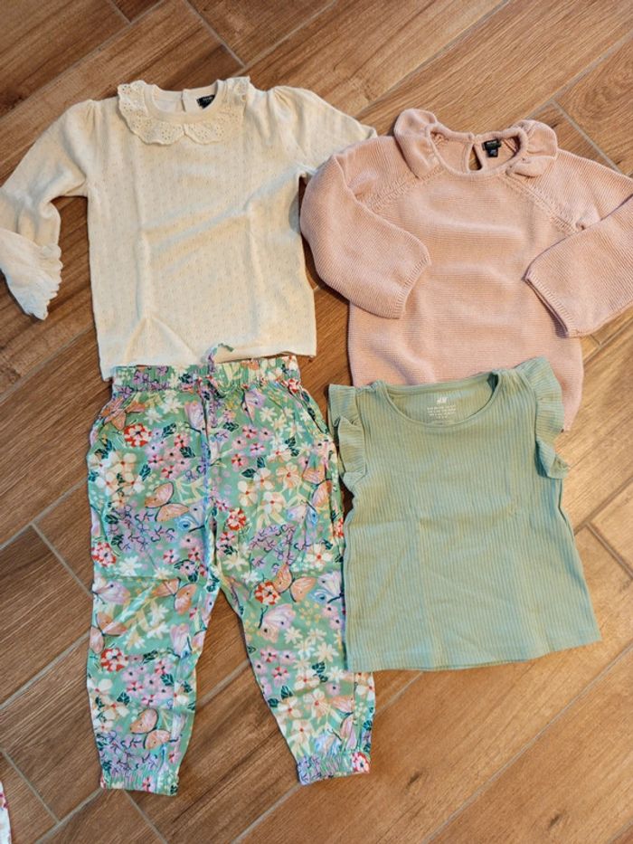 Lot/ensemble 3 ans H&M et Kiabi (convient a un 3/4 ans) Un pantalon fluide sarouel vert d'eau imprimé fleuri Un tee shirt détail volant manches vert d'eau Un pull coton rose col volanté Un pull coton fin écru en pointelle avec col et broderie anglaise et bas des manches dentelé Très bon état du lot