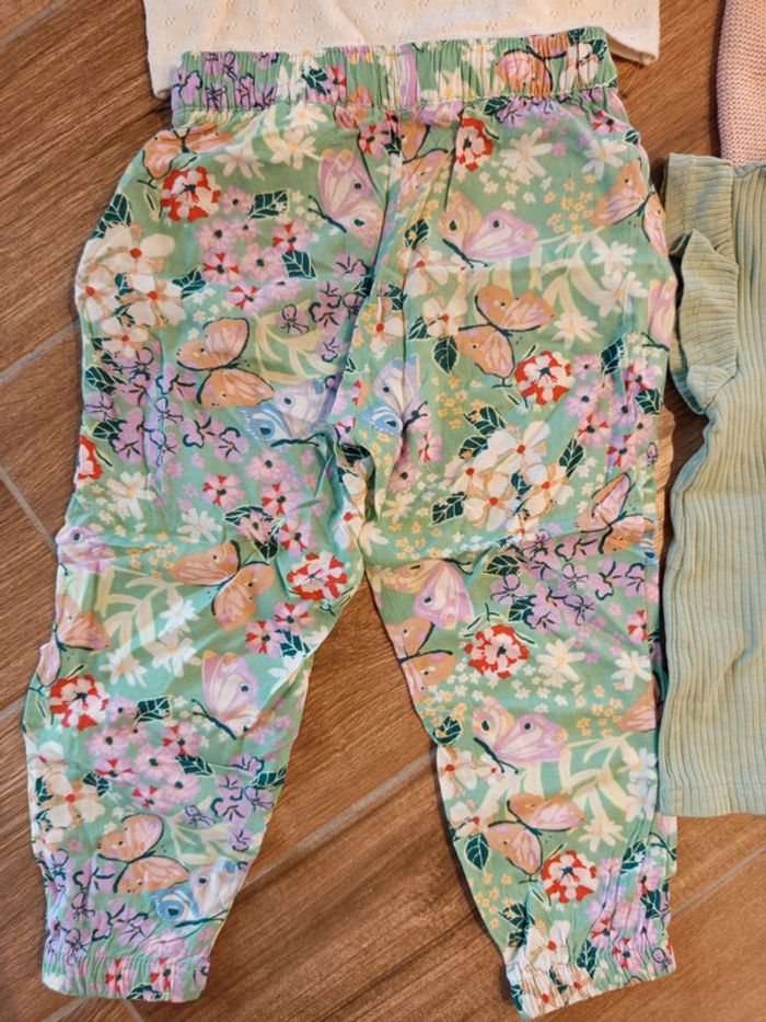 Lot 3 ans sarouel fleuri+ tee shirt vert d'eau+ 2 pulls: rose et écru pointelle - photo numéro 1