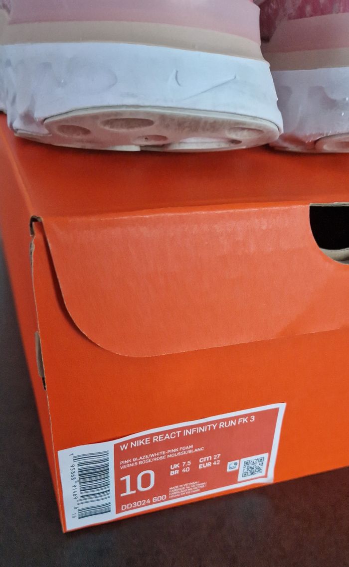 Nike React Infinity 3 pour femme, roses (coloris Pink Glaze/Pink Foam/Photon Dust/Blanc) Chaussures de running sur route ultra confortables (fluides et réactives, de vrais chaussons !) qui peuvent aussi servir au quotidien Attention : il s'agit d'une pointure 42 qui convient si vous chaussez habituellement du 40 (pas plus !) car ce modèle chausse TRES petit. Semelle : caoutchouc 100% / Extérieur : tissu 100% / Doublure : tissu 100% Excellent état (seule la semelle n'est pas immaculée car ces sneakers ont été portées mais très peu car trop petites pour mois finalement) Prix d'origine : 160€