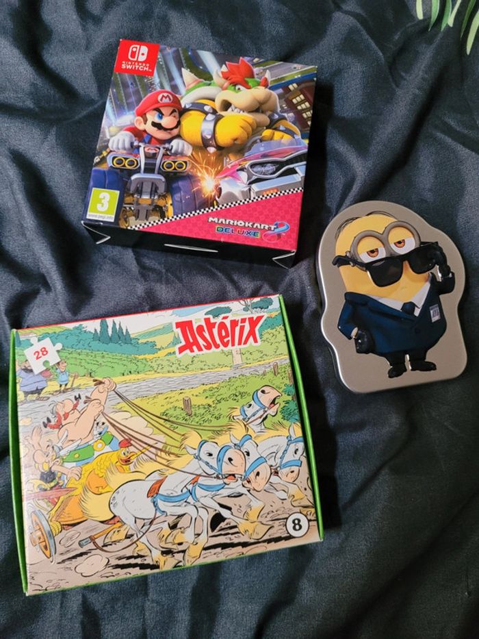 Lot mcdo de 1 poster avec jeux et des stickers Mario. Un puzzle asterix et obélix et une boîte vide les minions. Neuf.