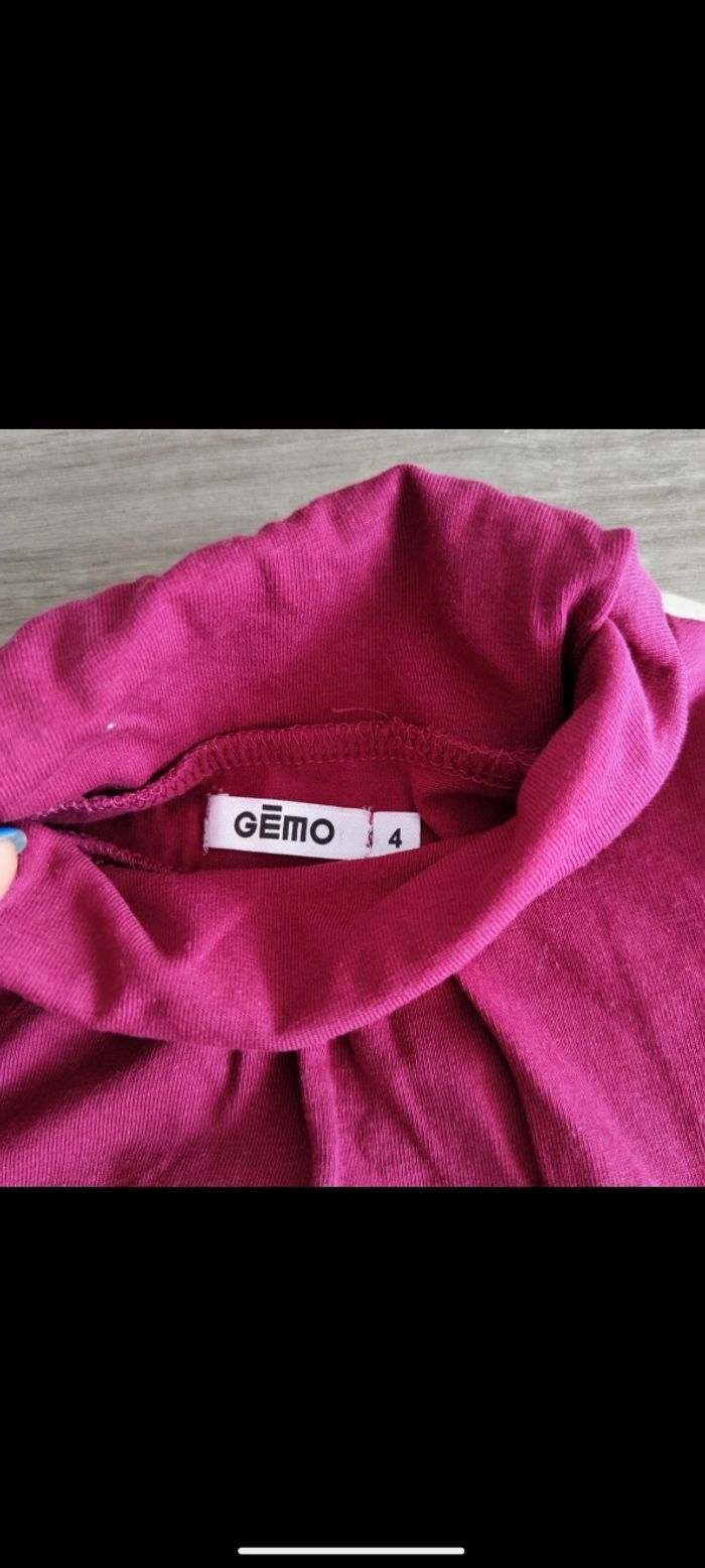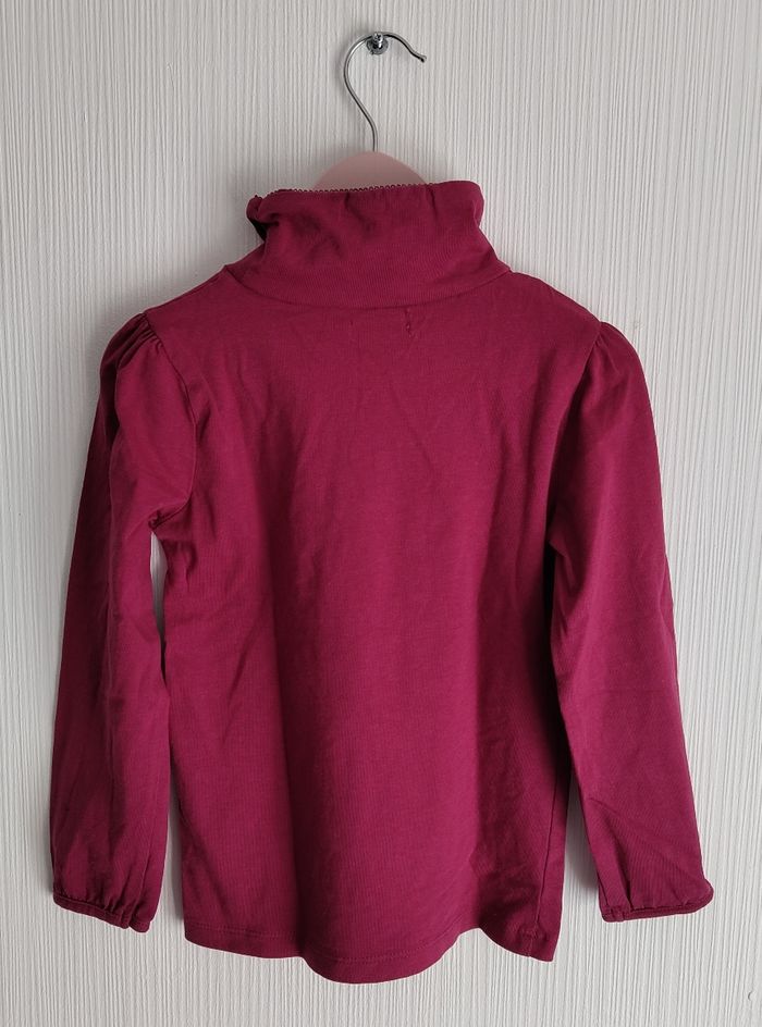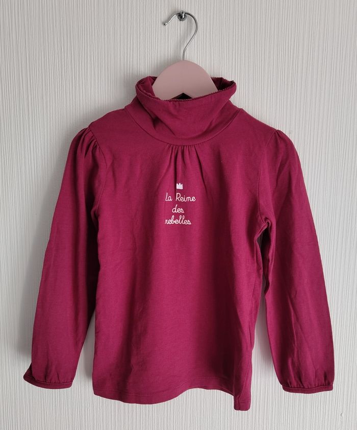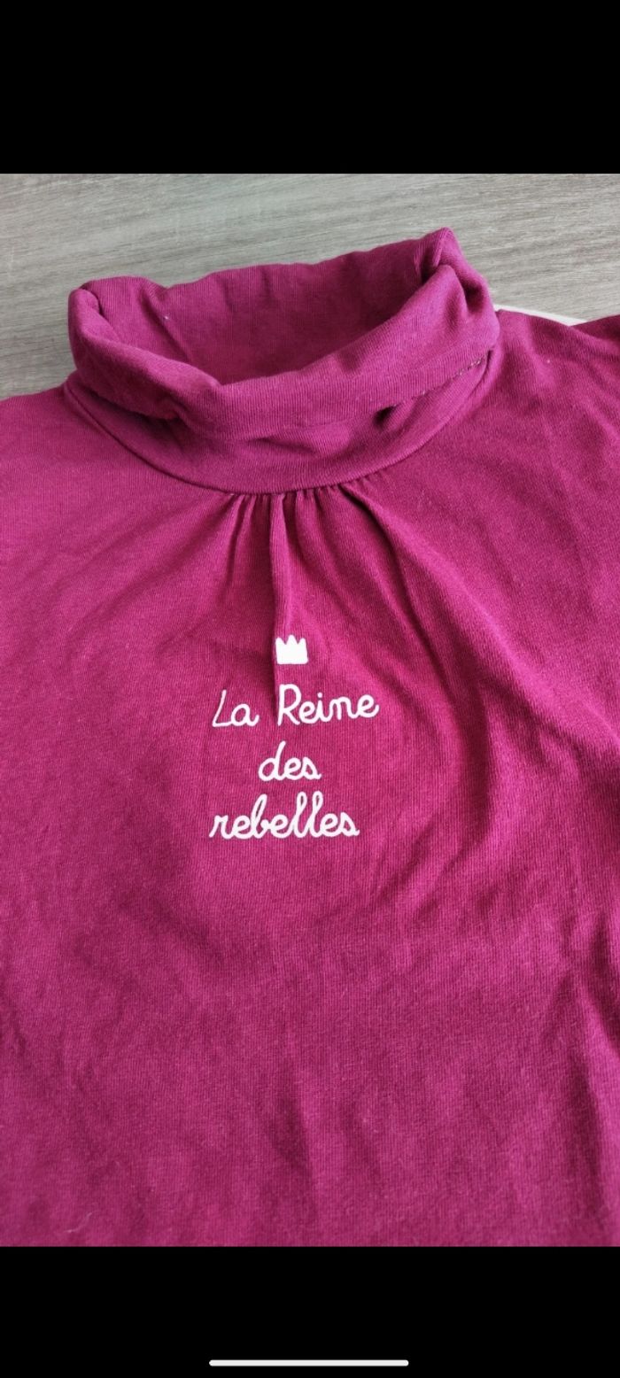 👧 Pull fin à col roulé. Couleur bordeaux inscription " la reine des rebelles" blanc crème. 👧 Taille 4 ans 👧 Marque : Gémo 👧 Très bon état.