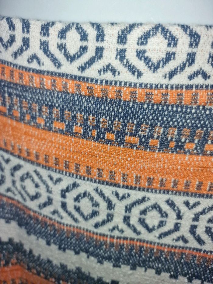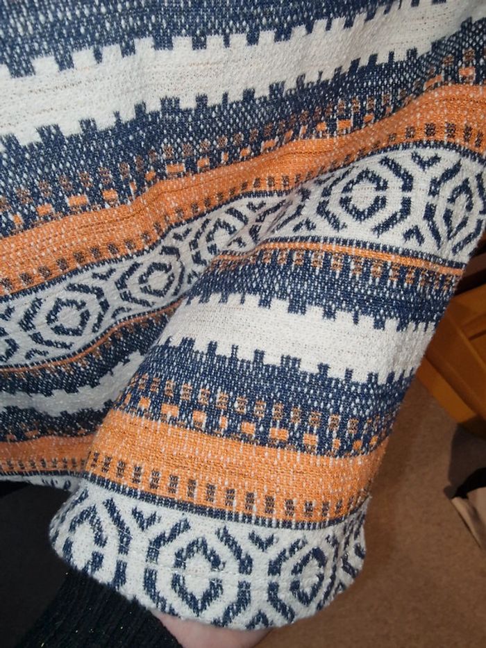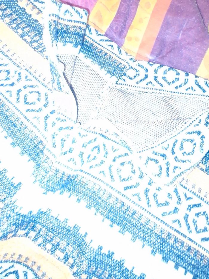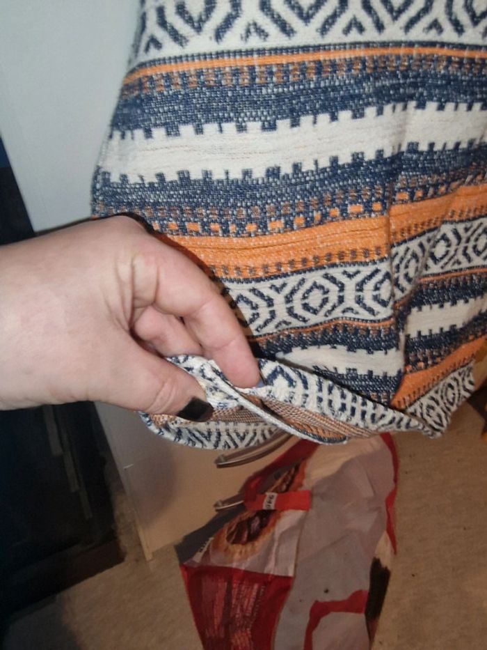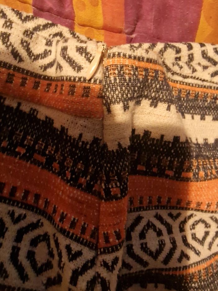 Jolie mini jupe avec drapage devant Ceinture élastiquée avec fermeture éclair en parfait état Tissu extensible Taille de 39cms à plat à 44cms en tirant Hauteur 39cms Je n'ai pas remarqué d'anomalie