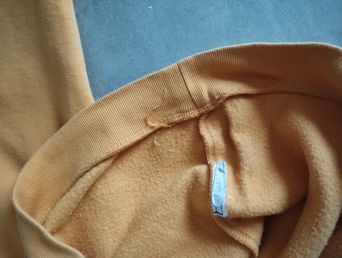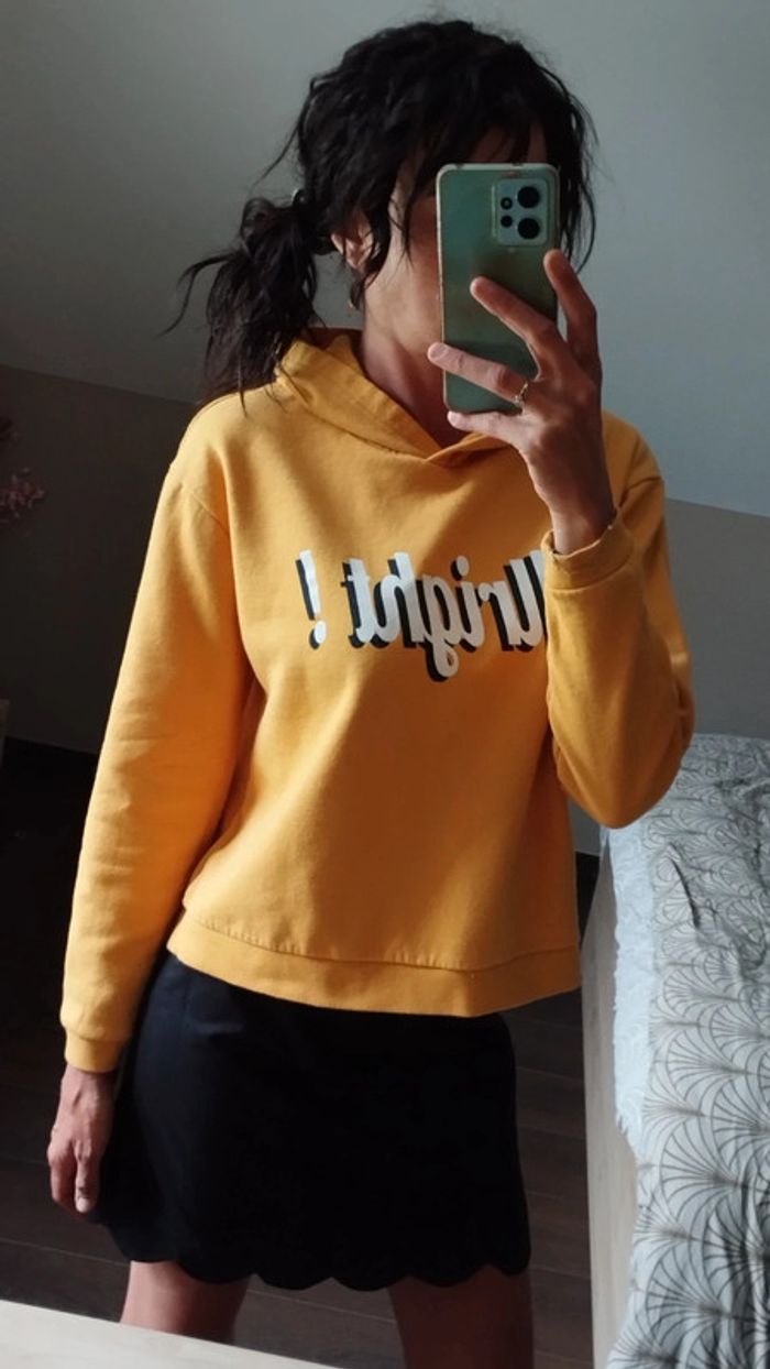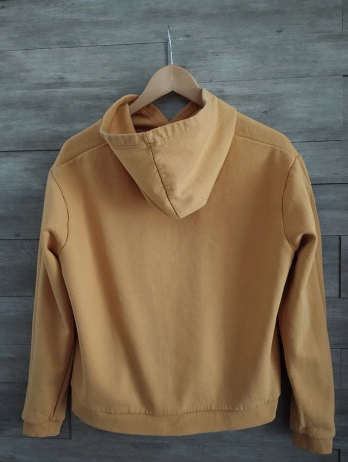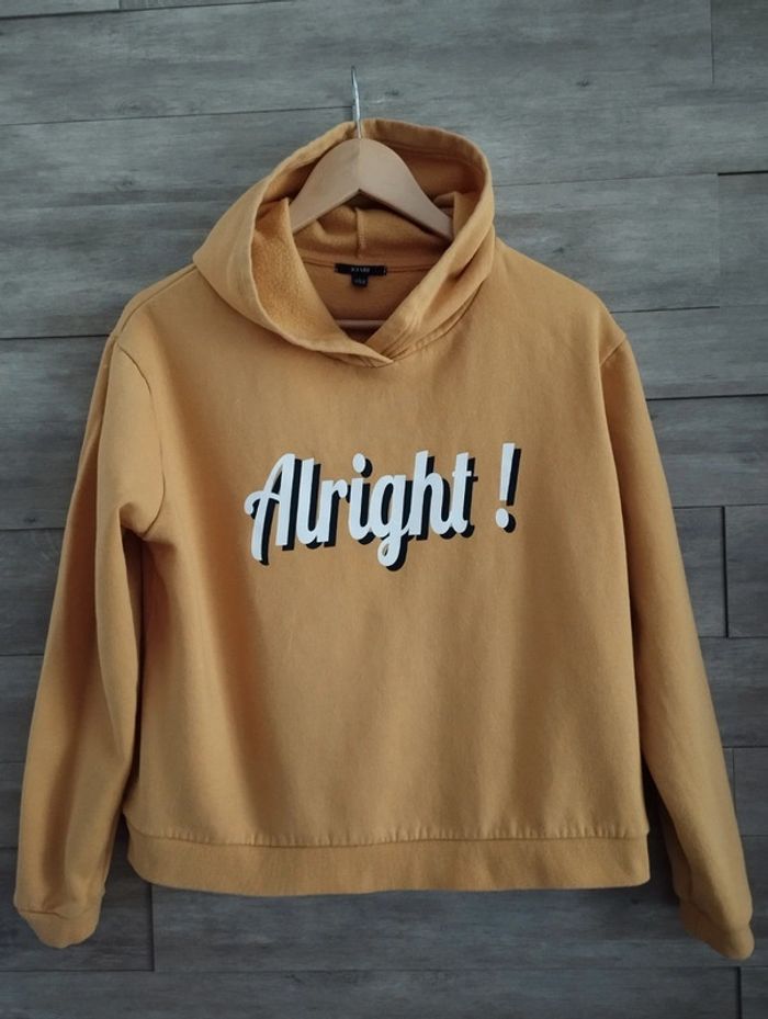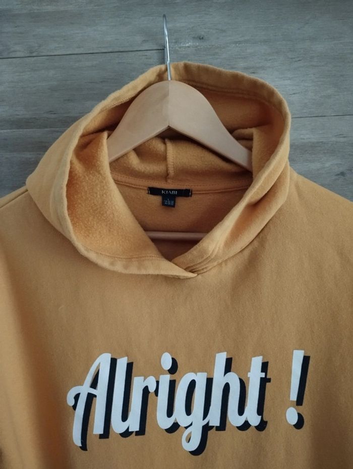Sweat capuche Kiabi jaune moutarde Albright! TL 2 traits noir très discret dans le dos cf dernière photo Longueur 56cm Largeur aisselles 58cm Largeur épaule 52cm