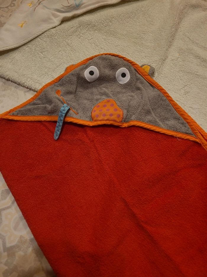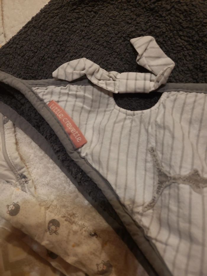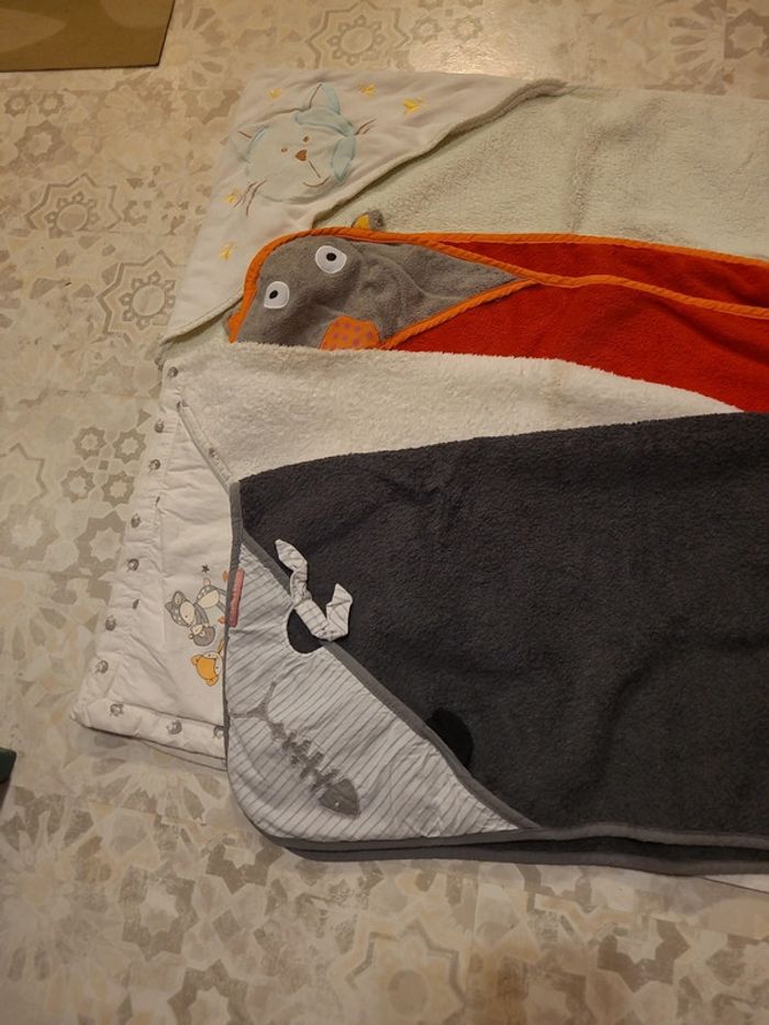 4 sorties de bain pour bébé De belles qualités Sergent major Little crevette Ebulobo Idéal pour la sortie du bain ou de la piscine En très bon état. Mais pas neuve comme me veux la catégorie Serviette Peignoir