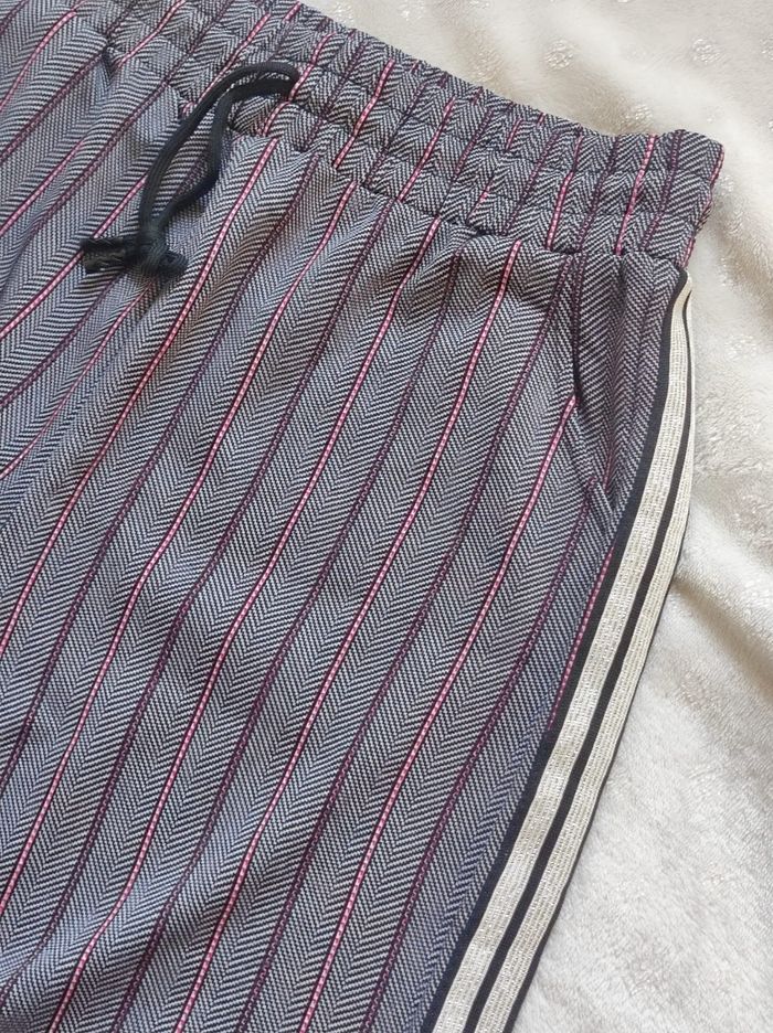 pantalon coupe droite, élastique à la taille avec cordon, poches sur le côté. A rayures rose et asymétrique avec bande brillante blanche sur le côté. Jamais porté, neuf. En taille XL /XXL.