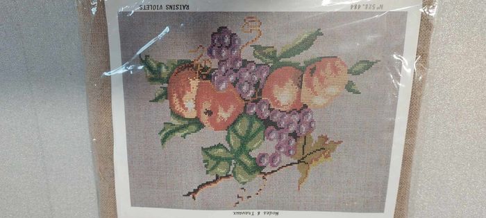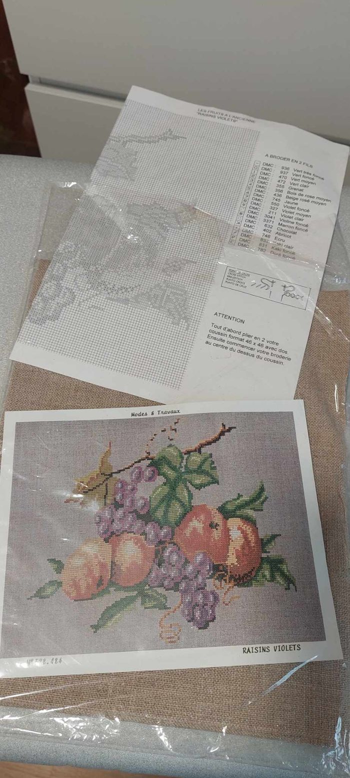 Joli kit de broderie point de croix housse de coussin, marque Modes & Travaux, Création Margot de Paris, les fruits à l'ancienne "raisins violets", comprenant une toile écrue foncée pour coussin format 46 x 46 cm, les fils à broder de marque DMC 100 % coton, l'aiguille ainsi que le diagramme avec explications. Neuf et emballé. Toujours vendu aux alentours de 45 €...
