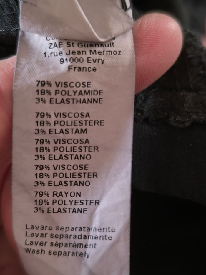 Pantalon noir T44 il comporte une auréole voir photo 3 Peu porté 79% viscose 18% polyamide 3% élasthanne