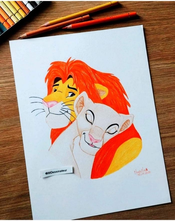 Dessin de Simba & Nala (adultes) fait à la main Format A4 Papier Canson déco idéal pour une chambre d'un enfant fan du roi lion