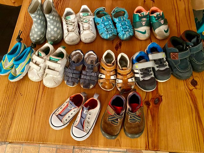 Rangée du fond chaussures offertes Rangée du milieu entre 2 et 4€ la paire Rangée de devant 8€ la paire Marques variées adidas, Stan Smith, Nike, converse, quechua, gbb, décathlon Possible à l’unité au détail , plus de photos sur demande Lot complet 30€