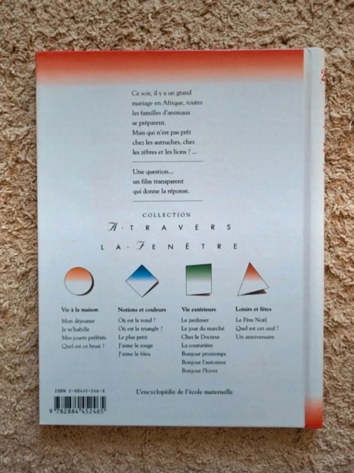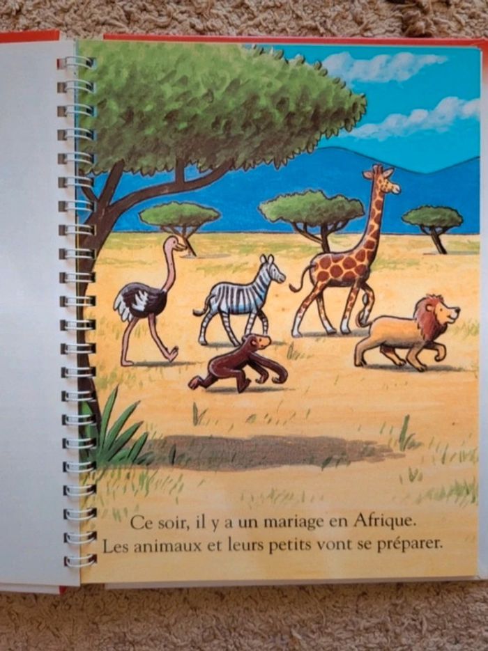 . Livre pour enfant "Un mariage" de la collection À travers la fenêtre des Éditions Calligram . Couverture cartonnée et 24 pages plastifiées reliées par une spirale en excellent état . Certaines pages sont transparentes pour créer un effet de suprise . Parfait pour apprendre les animaux de la savane ⭐️ N'hésitez pas à visiter mon dressing : les réductions sur les lots sont activées ✨️ Magique Maternelle Lecture
