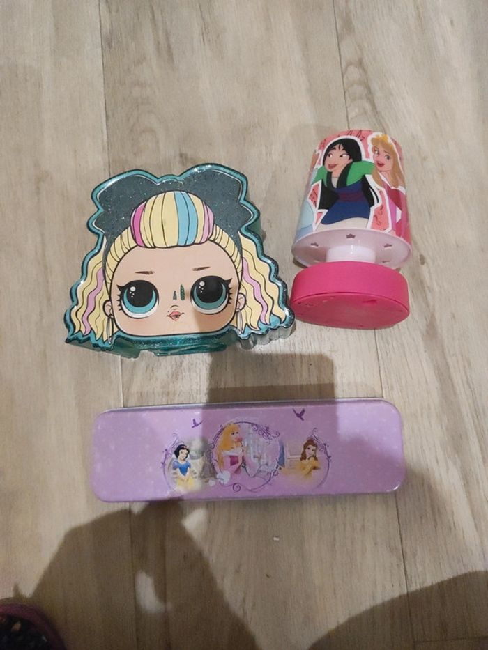 Le lot se compose d'une tirelire poupée lol Une boîte métal Disney princesses et une lampe de chevet Disney princesses fonctionne a piles N'hésitez pas à regarder mon dressing j'ai d'autres articles les réductions sont activées 😉