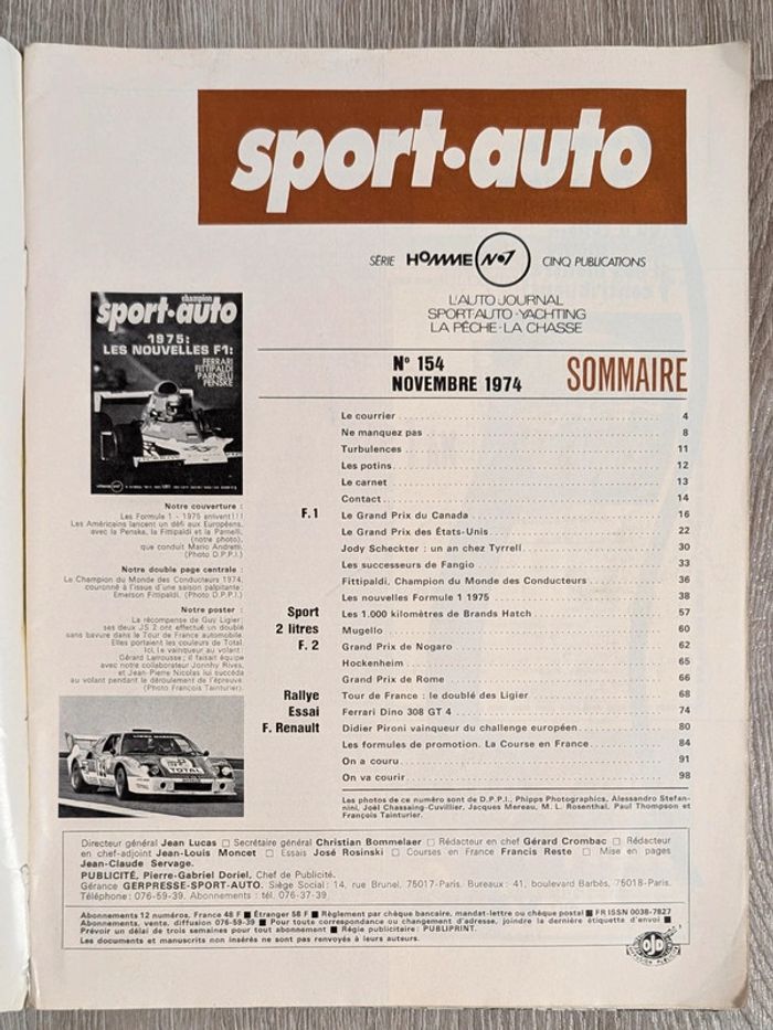 #_SportAuto_ Numéro 154 (novembre 1974) Formule 1, 1000 km de Brands Hatch, Mugello, Nogaro, Hockenheim, Tour de France, Ferrari Dino 308 GT 4, Didier Pironi... 90 pages Couverture un peu abîmée