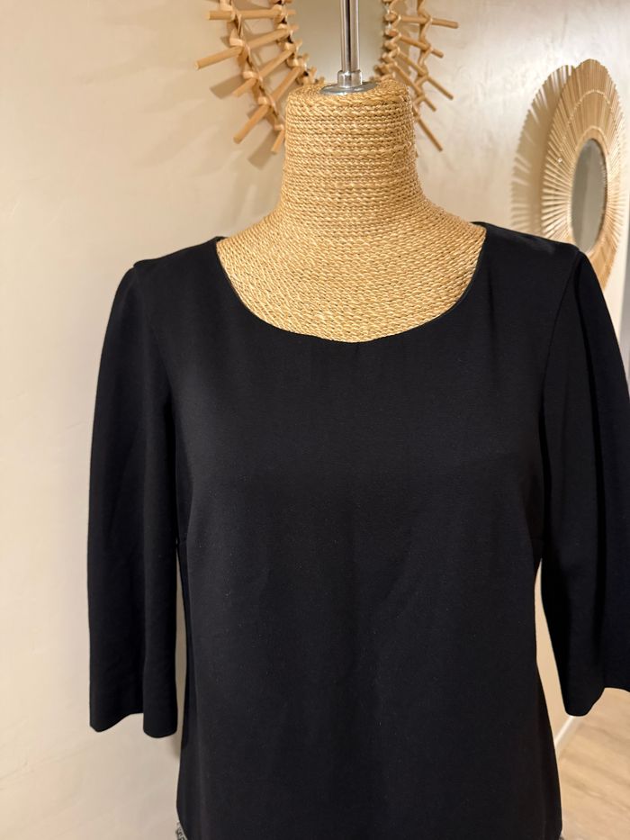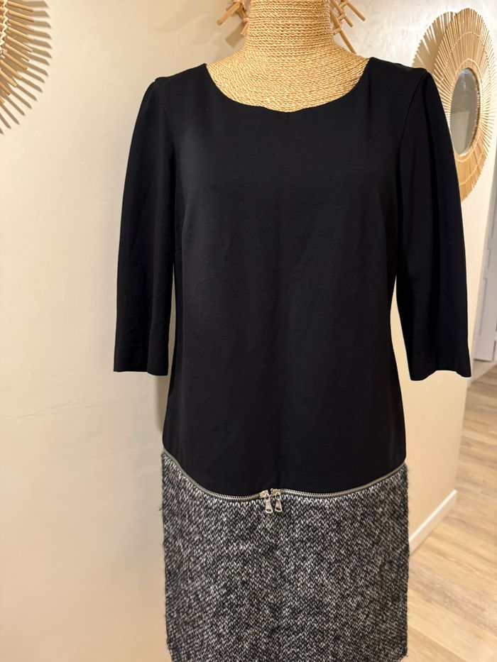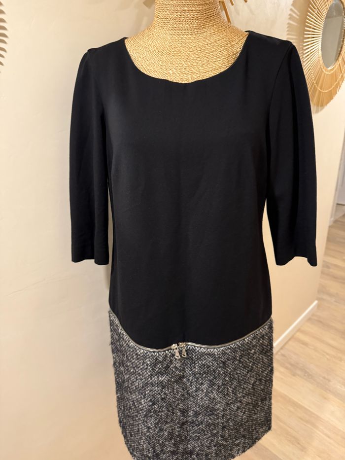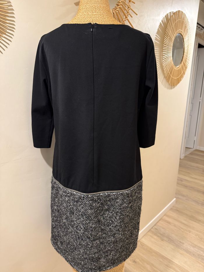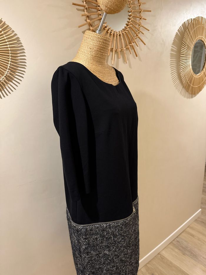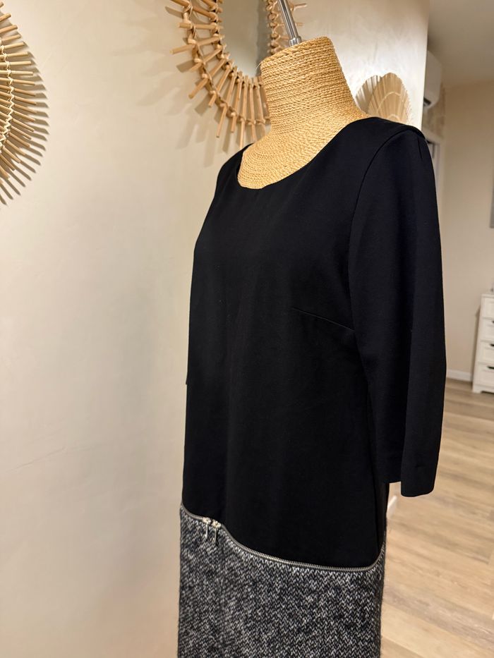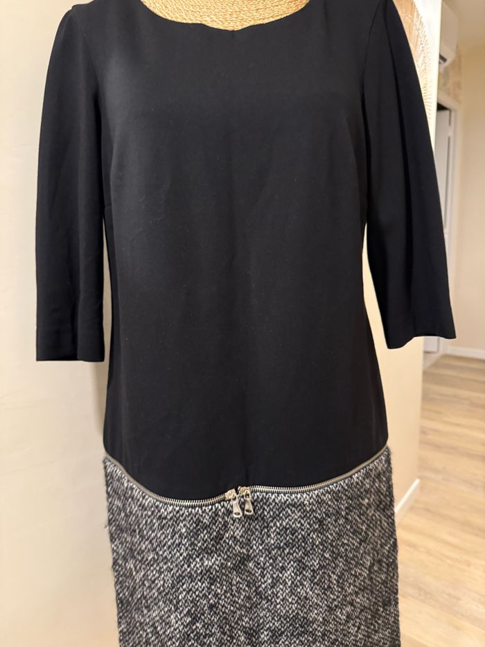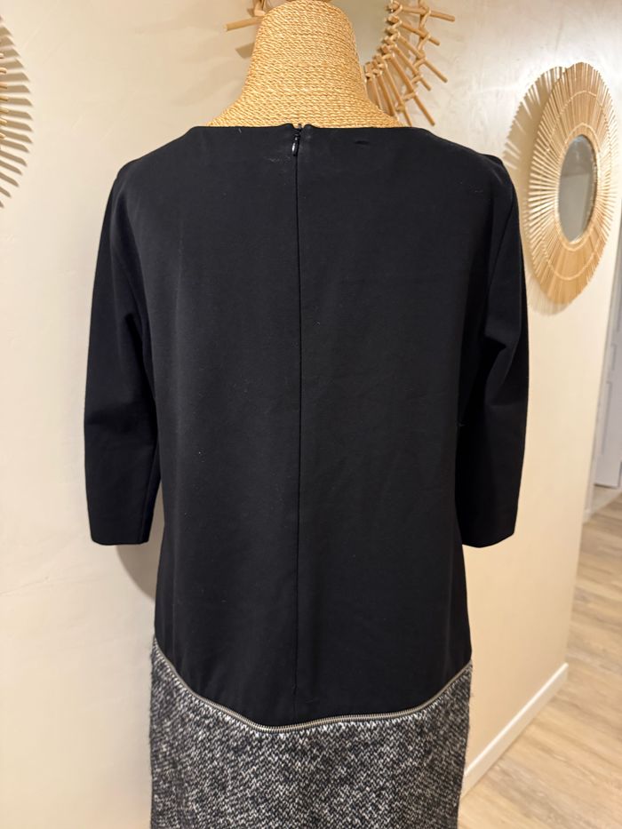 Robe droite noire en haut avec zip à la taille qui ne s’ouvre pas et bas en laine blanc et noir Fermeture zippée invisible au dos Largeur aisselles à aisselles - 45 cm Longueur 94 cm