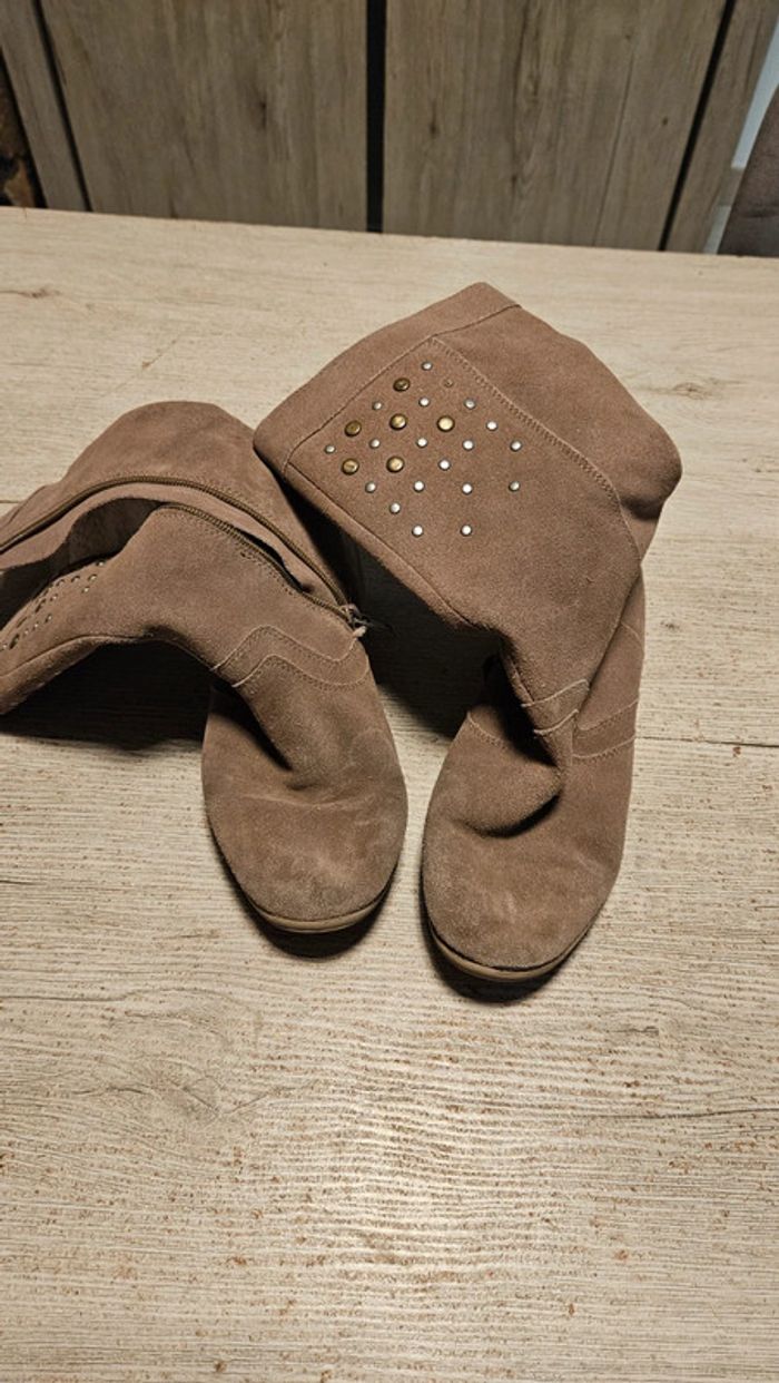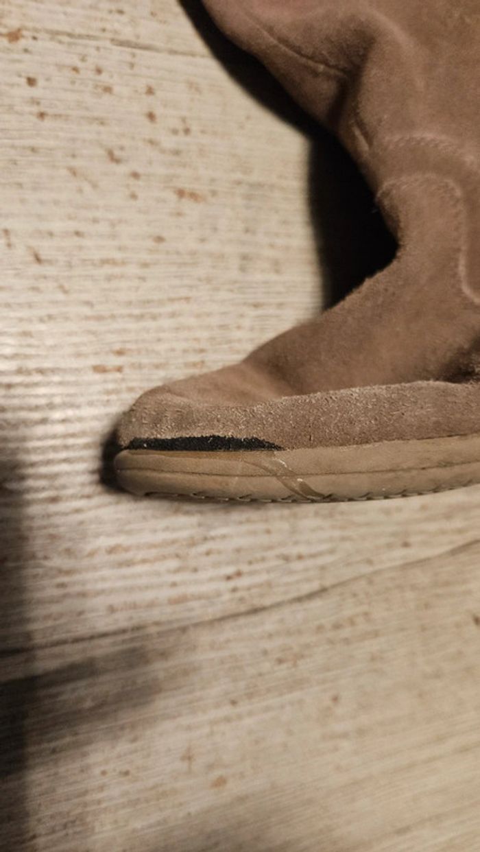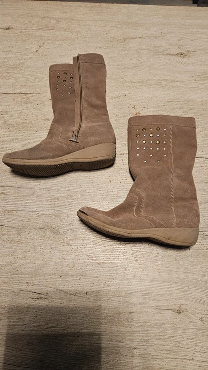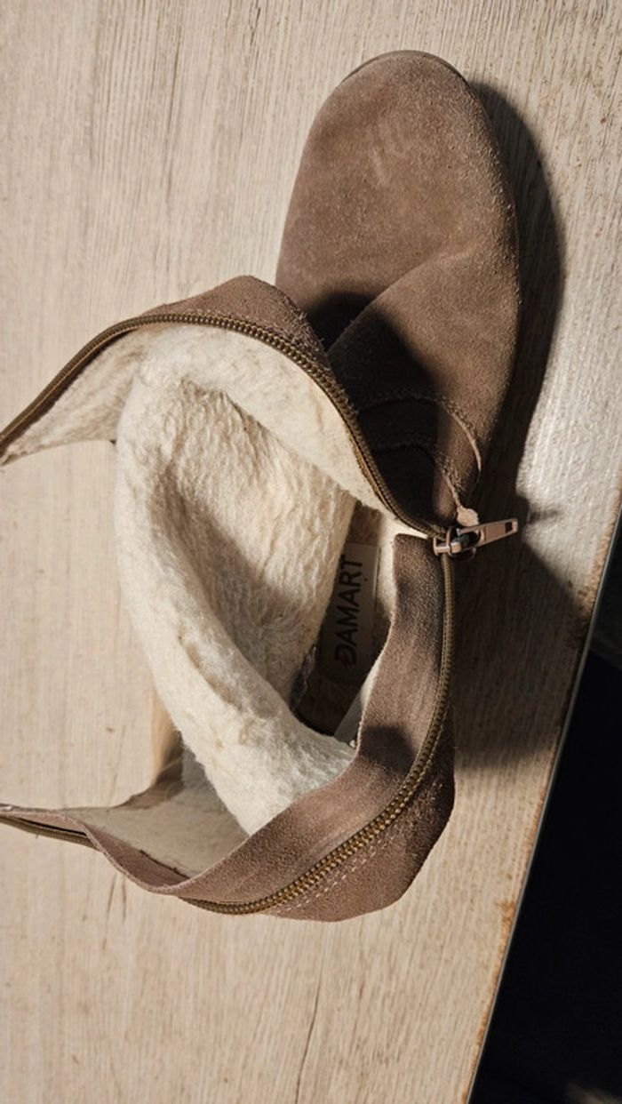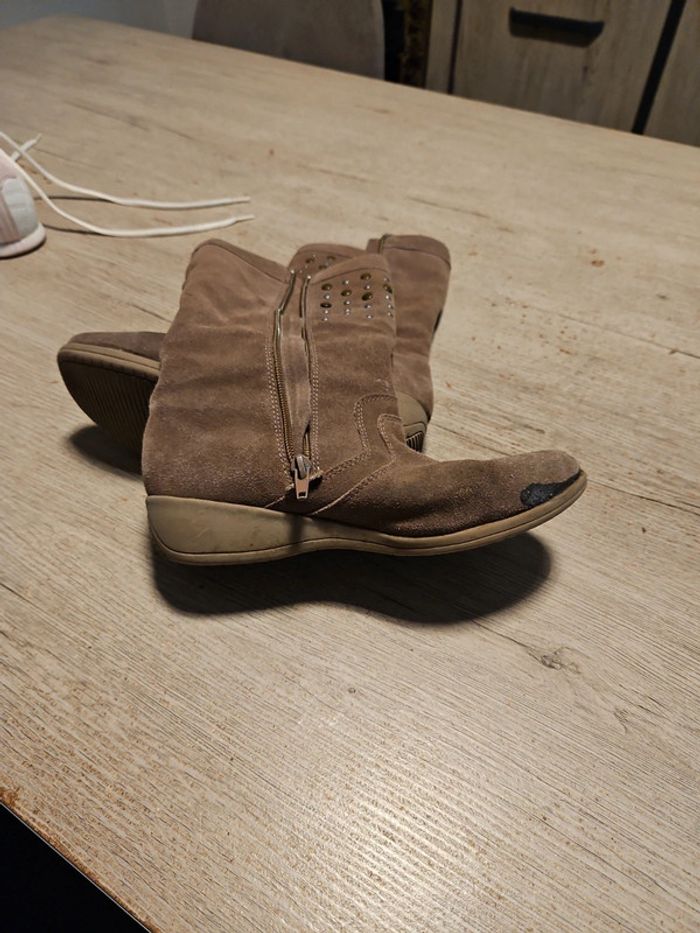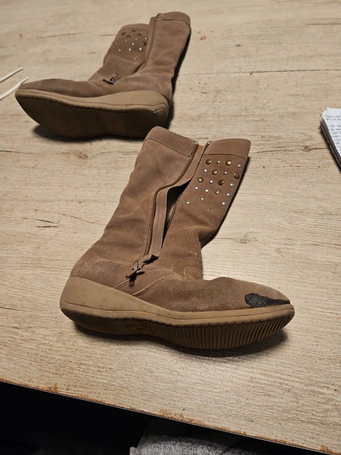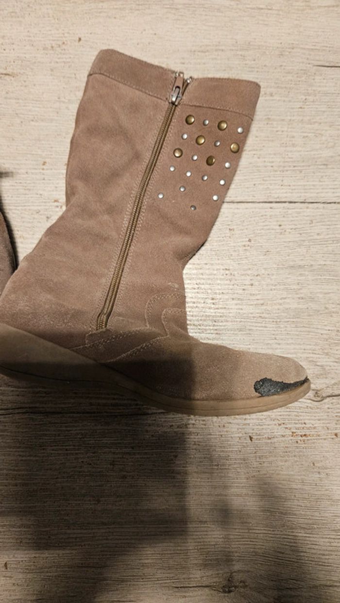 Bottes en nubuck brun clair qui se ferment avec 1 tirette. Elles ont été mise 2 fois donc très bon état mais ma fille a fait couler de la colle sur le bout de la botte gauche. #deborahtock_chaussures_enfant