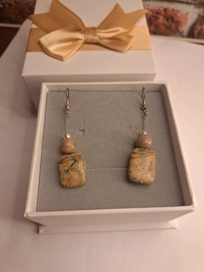 Boucles d'oreilles pendante avec perles carré marron marbré avec perles ronde marron et petites perles de rocaille argenté Original
