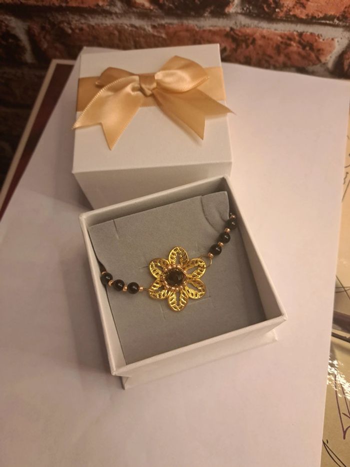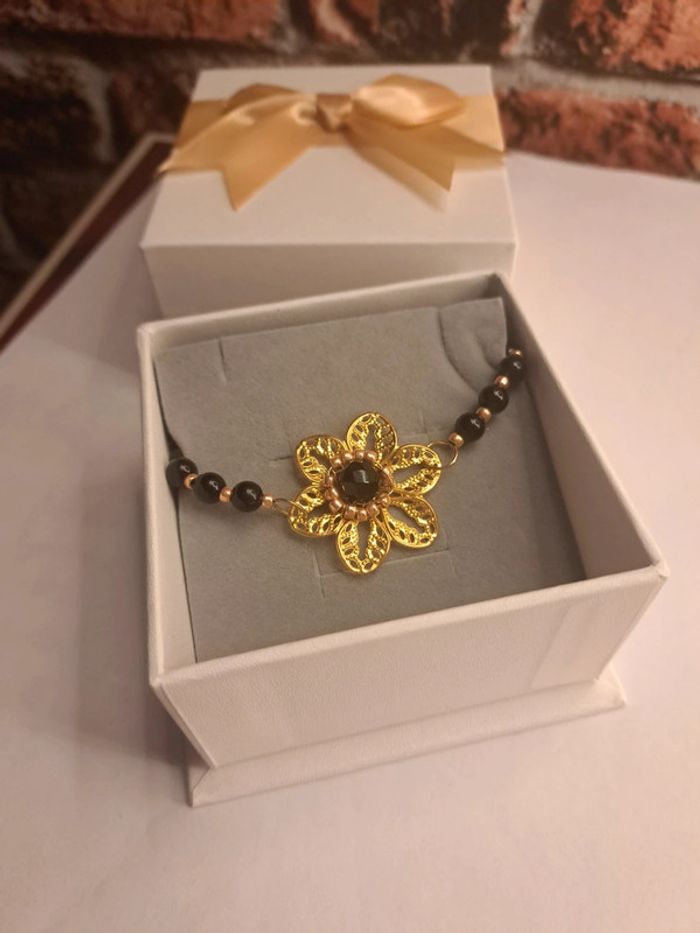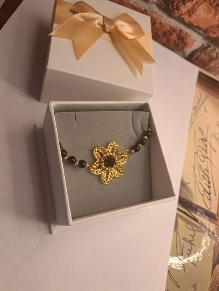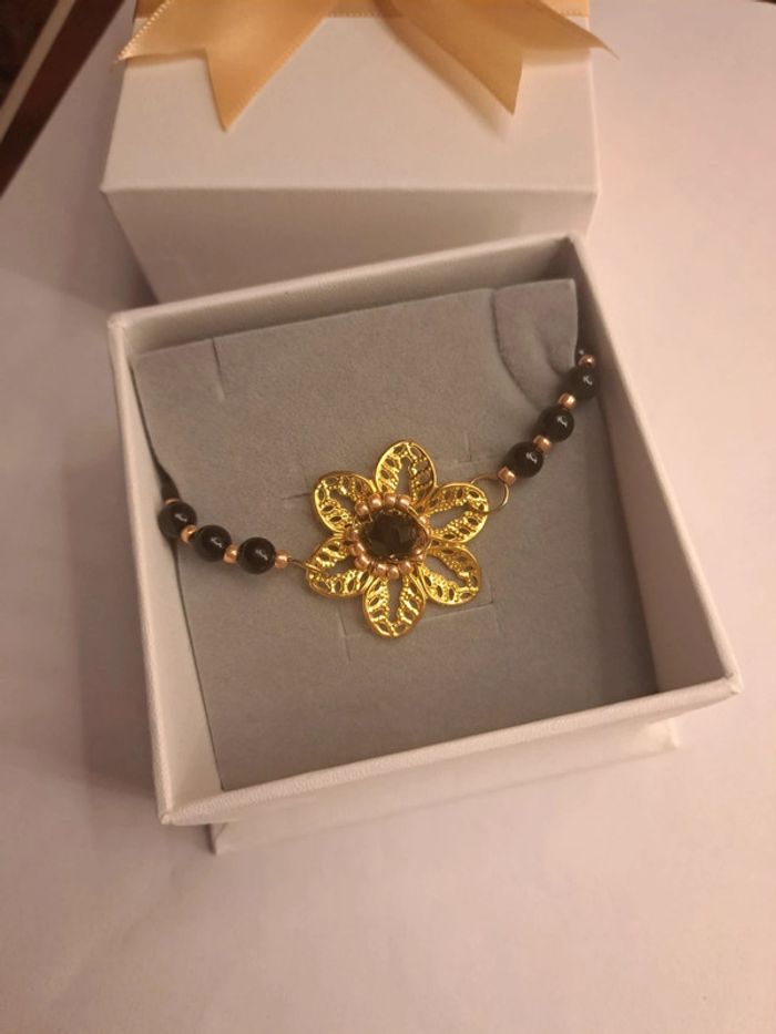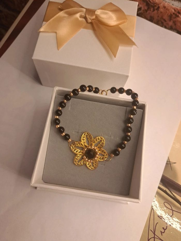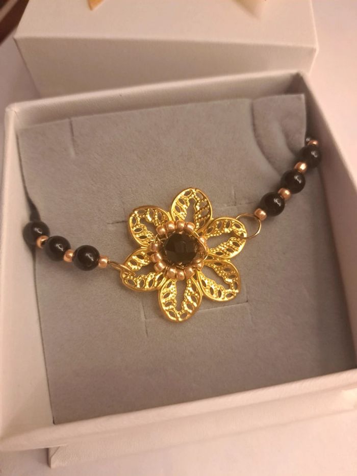 Bracelet avec perles noir ronde et petites perles de rocaille doré estampes fleur doré avec perles noir ⚫️ Chic élégant bohème