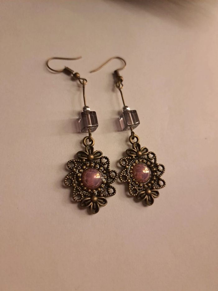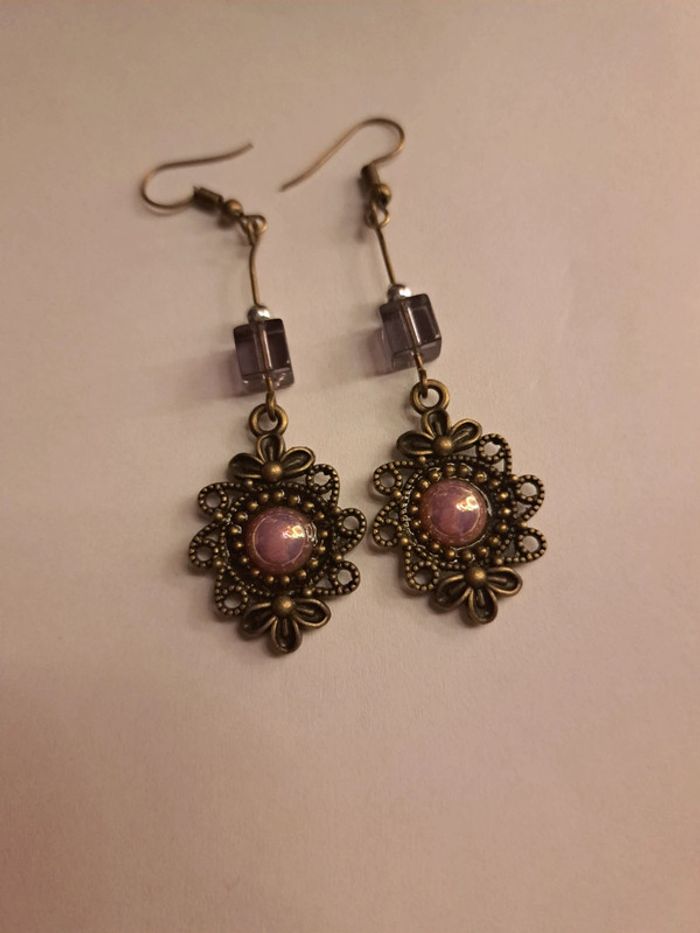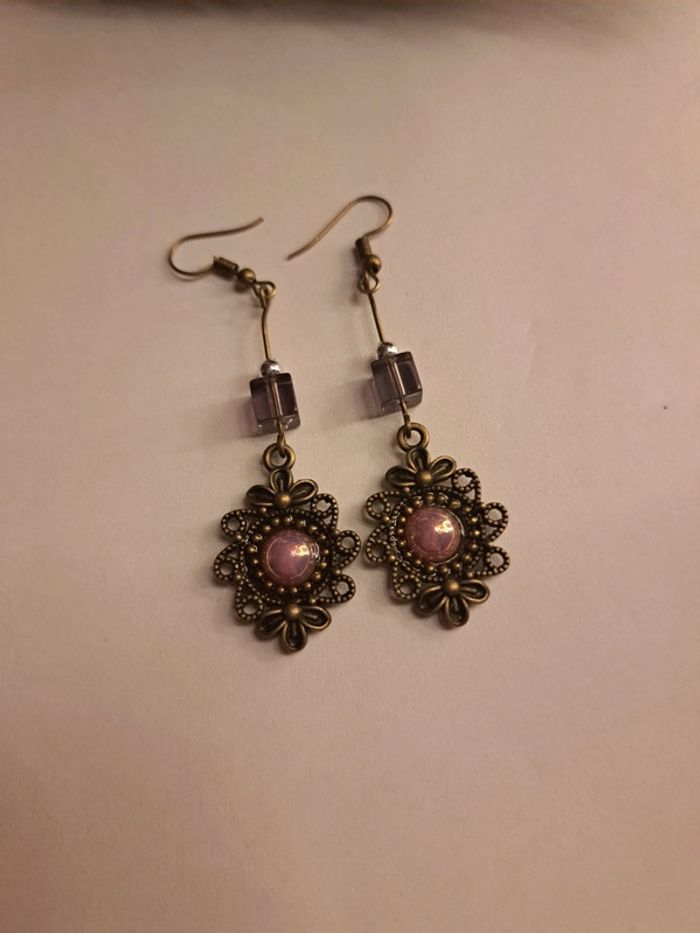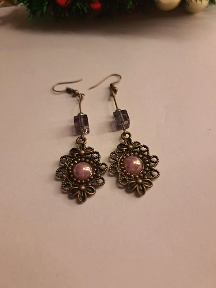 Boucles d'oreilles pendante bronze violet rose - photo numéro 1