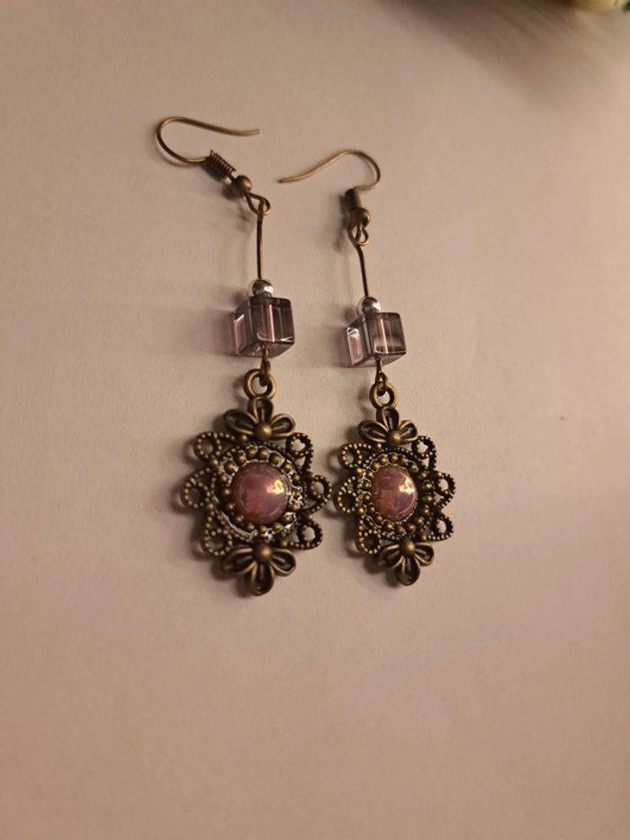 Boucles d'oreilles pendante bronze violet rose - photo numéro 2