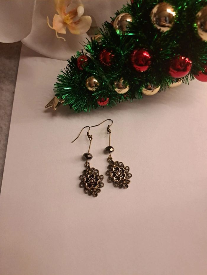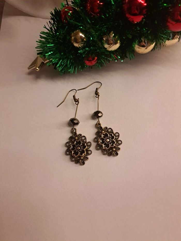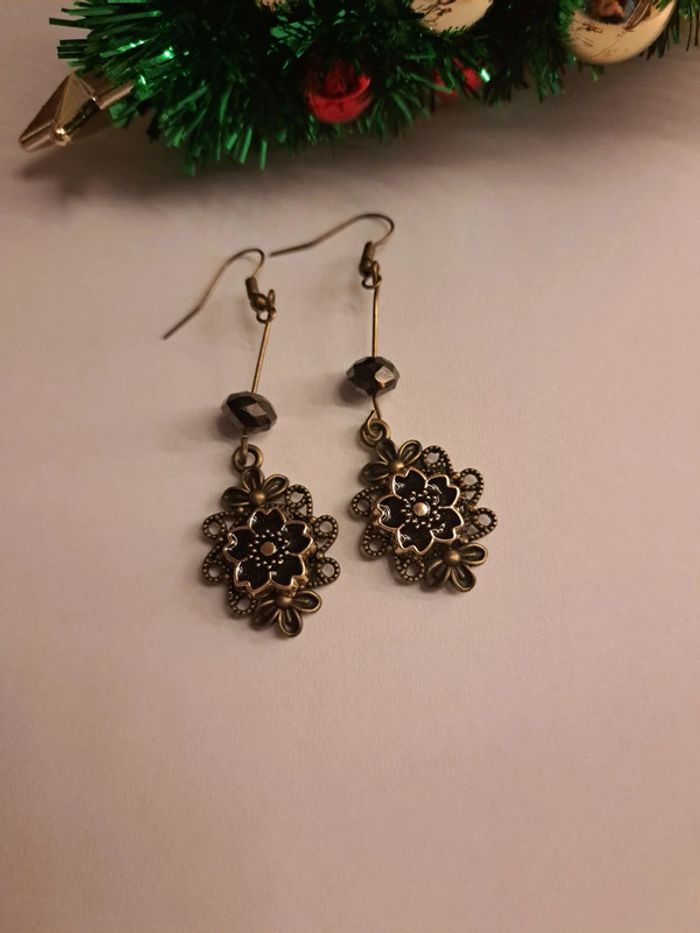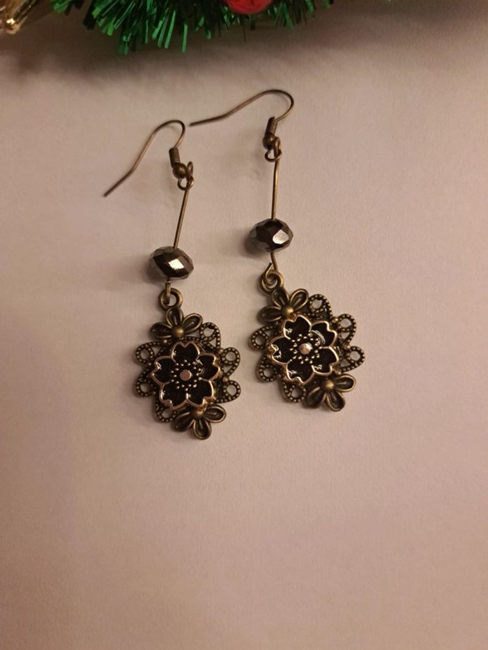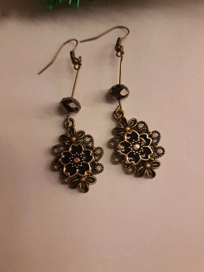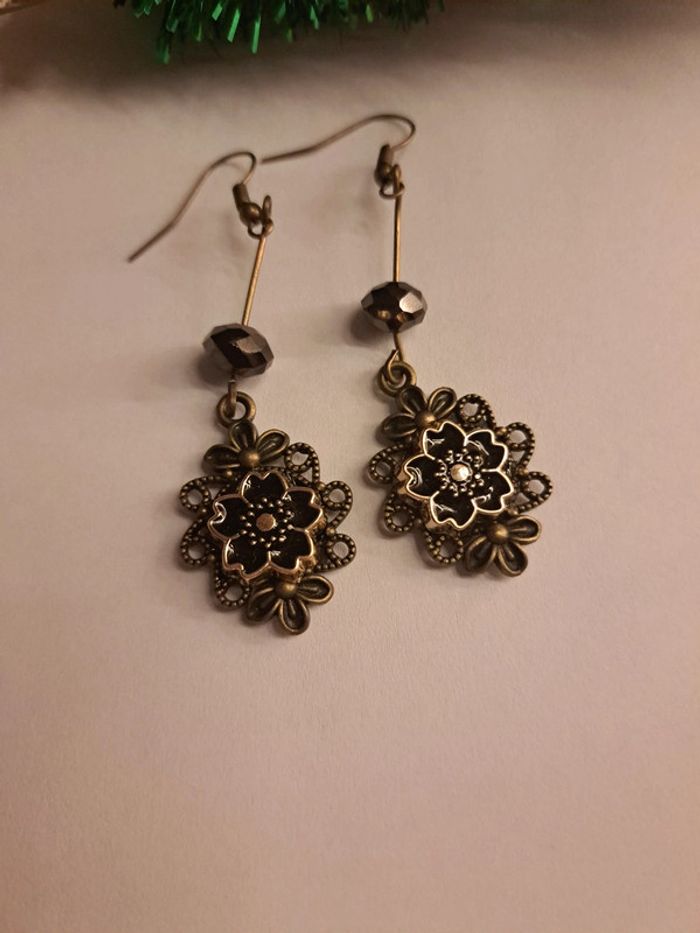 Boucles d'oreilles pendante style victorien avec pendentif couleur bronze petite fleur centrale noir et argenté avec perles toupille facettes écrasée Très jolie