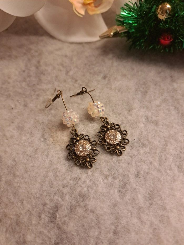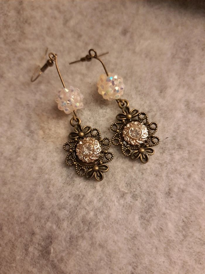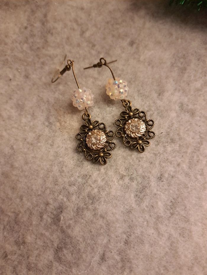 Boucles d'oreilles pendante avec pendentif couleur bronze Style victorien avec petit strass blanc formant une petite fleur avec perles blanc crème à reflet Très jolie