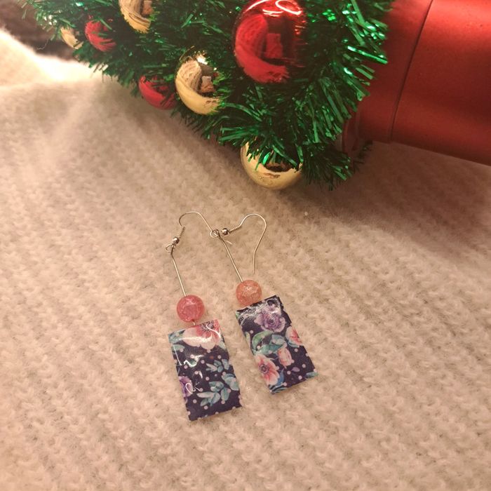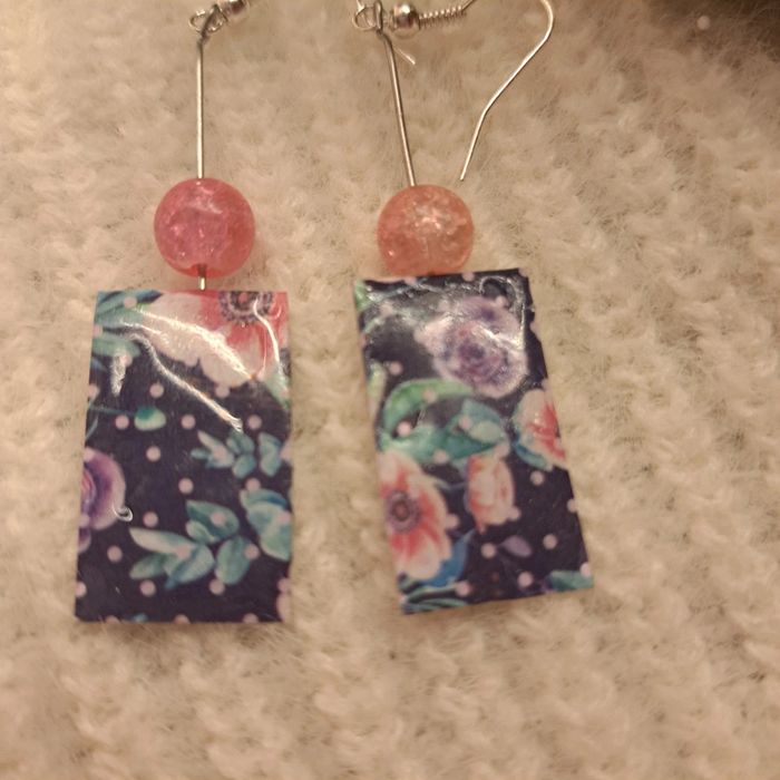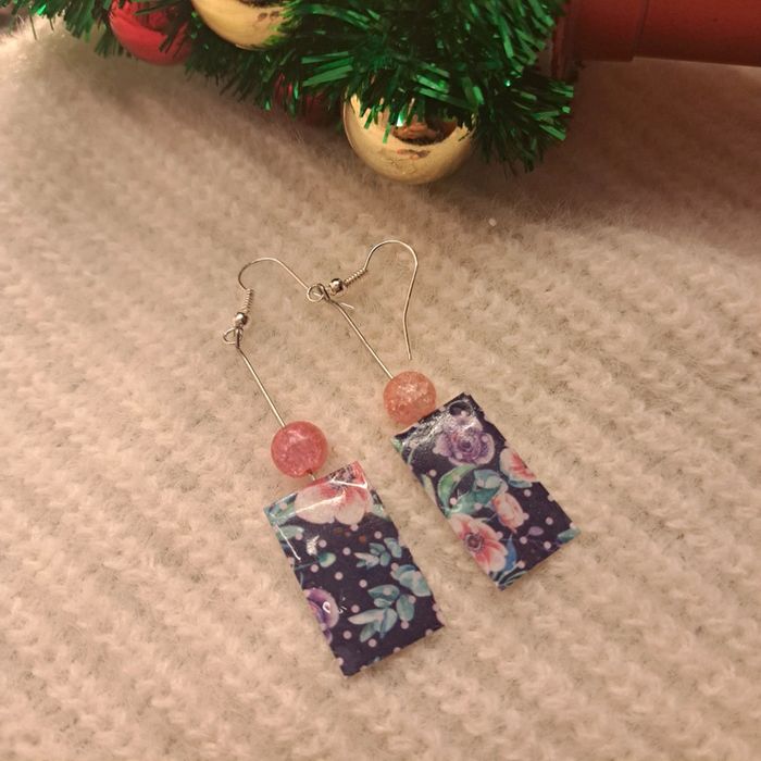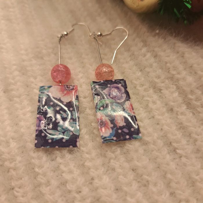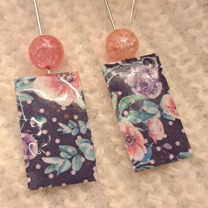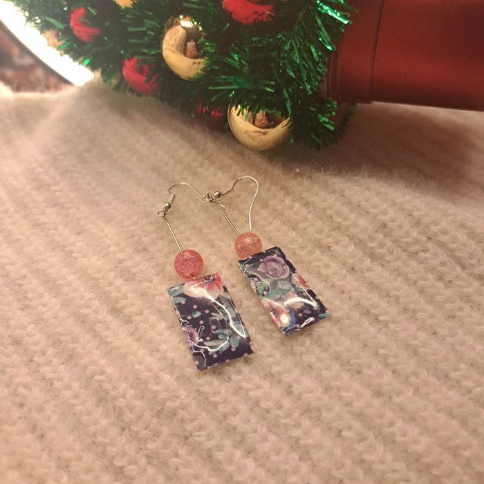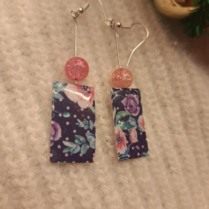 Boucles d'oreilles pendante rectangulaire petit avec inclusion papier florale bleu et rose multicolore bohème champêtre