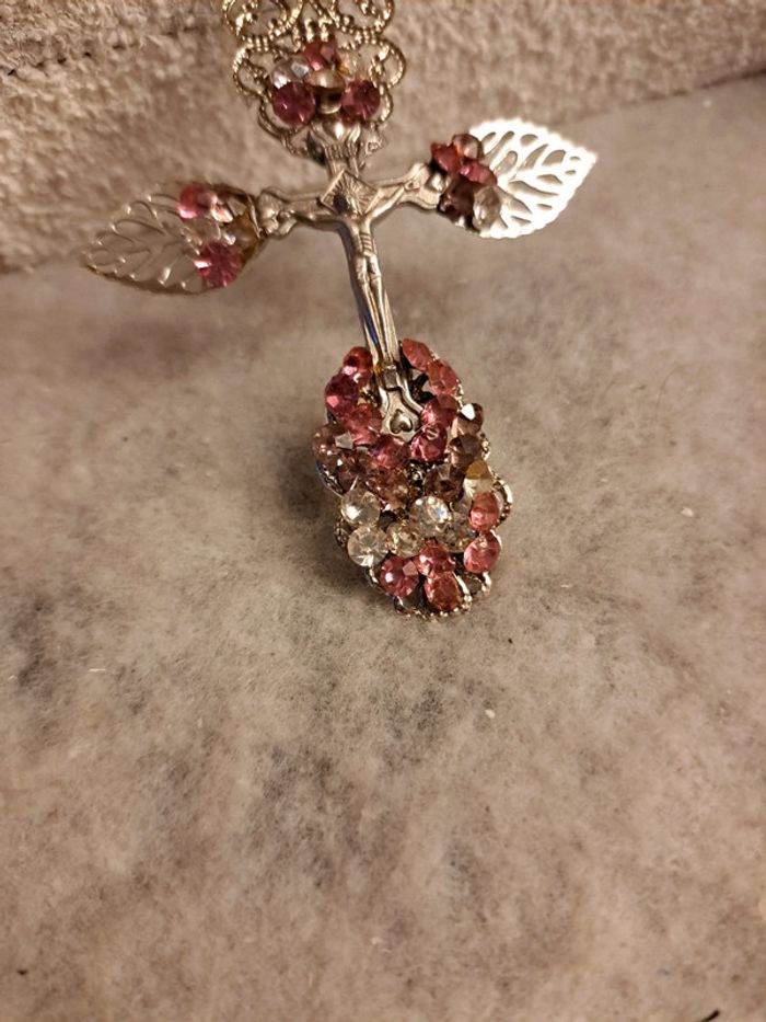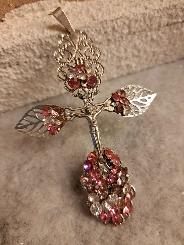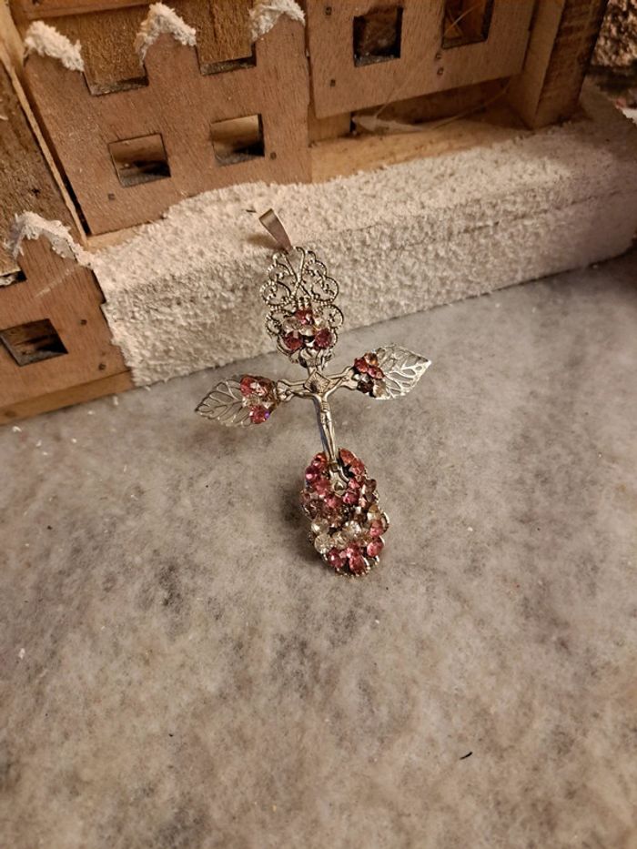 Croix argenté avec strass rose et blanc - photo numéro 7