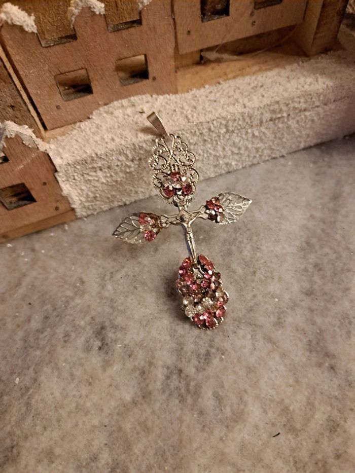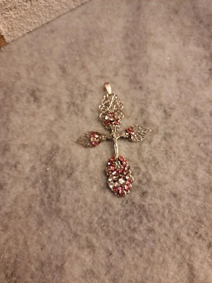 Croix argenté avec strass rose et blanc - photo numéro 4