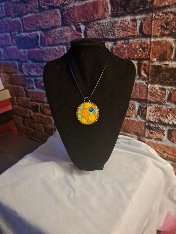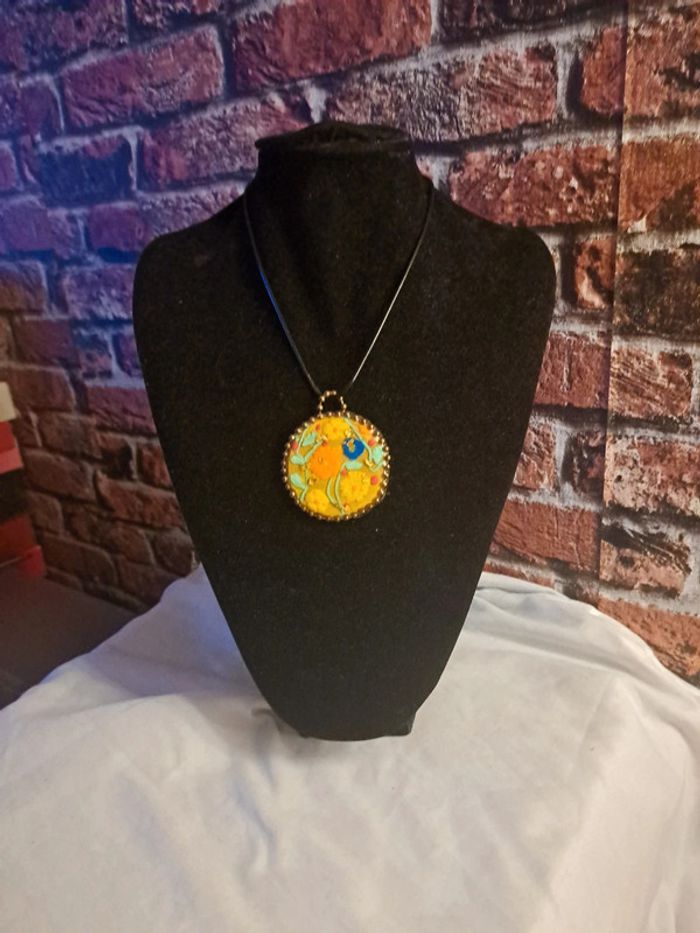 Collier cordon noir avec pendentif en pâte polymere multicolore florale et couches de résine Original champêtre