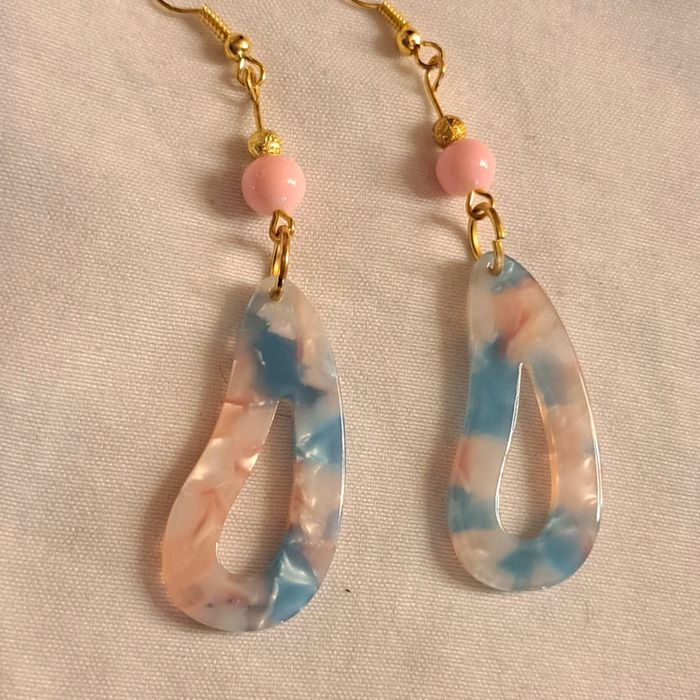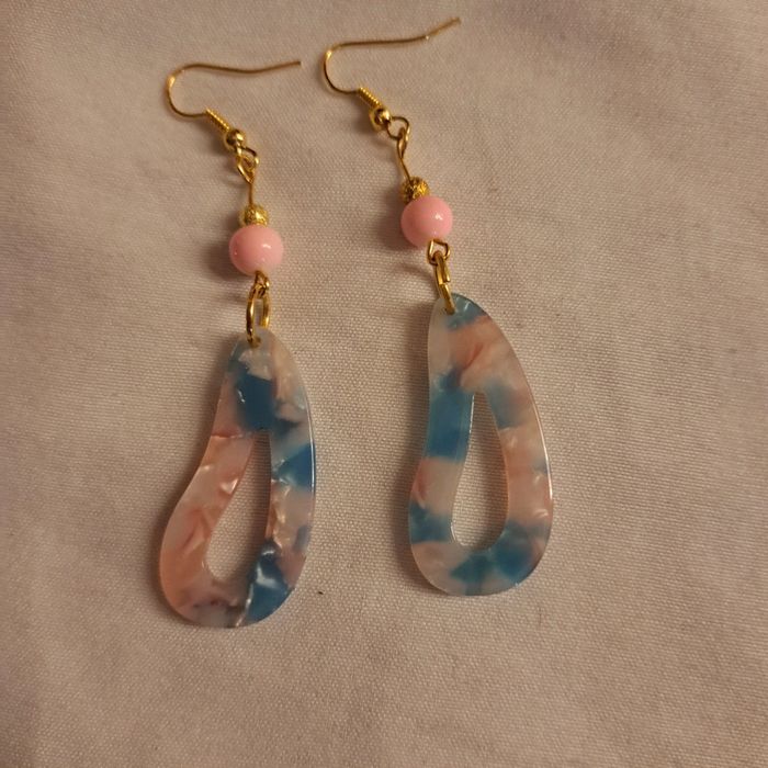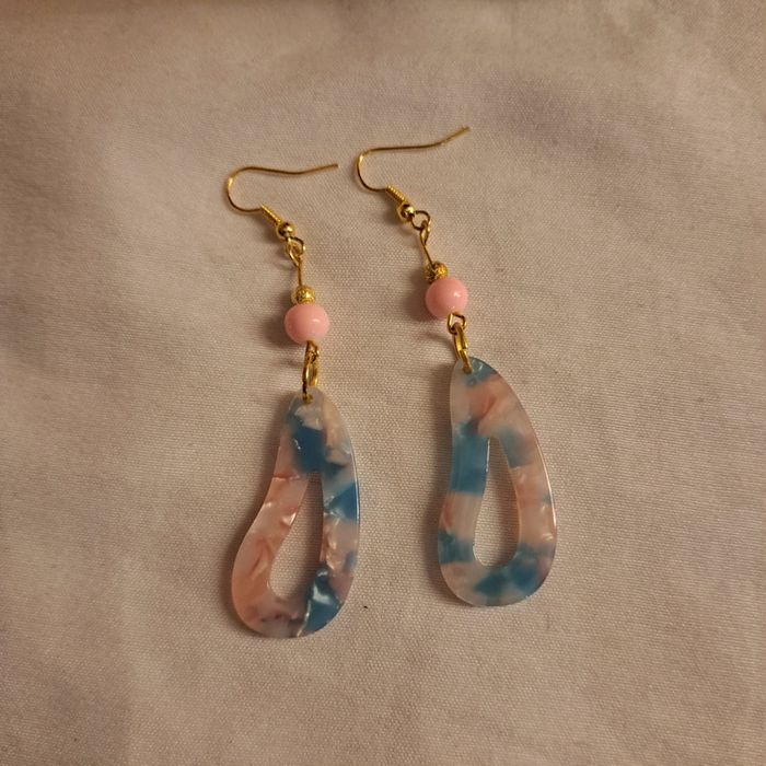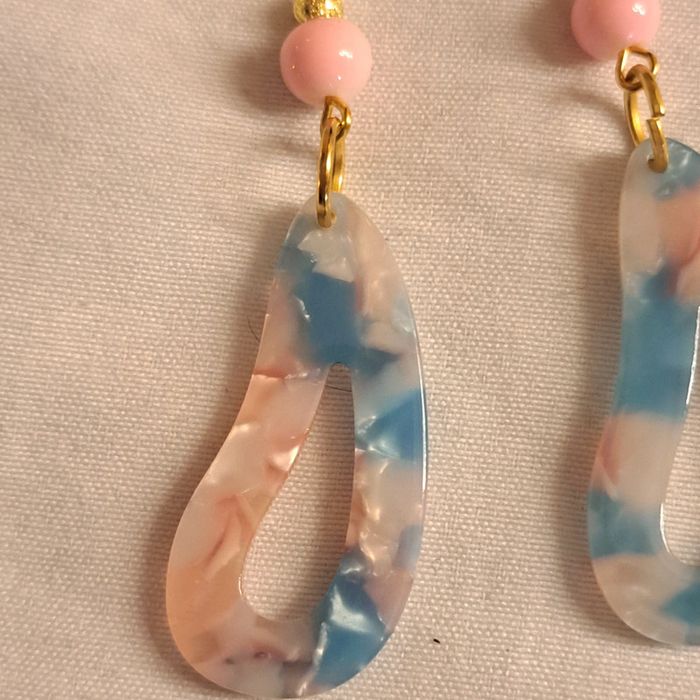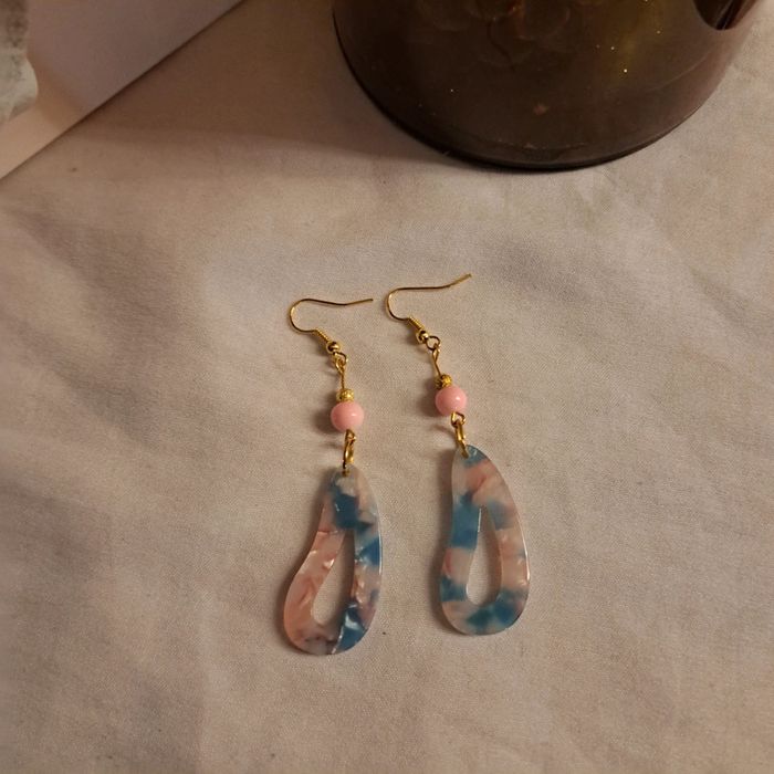 Boucles d'oreilles pendante avec perles cetate bleu et rose marbré forme gouttes déformé avec petite perles ronde rose et doré Bohème