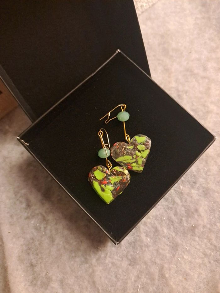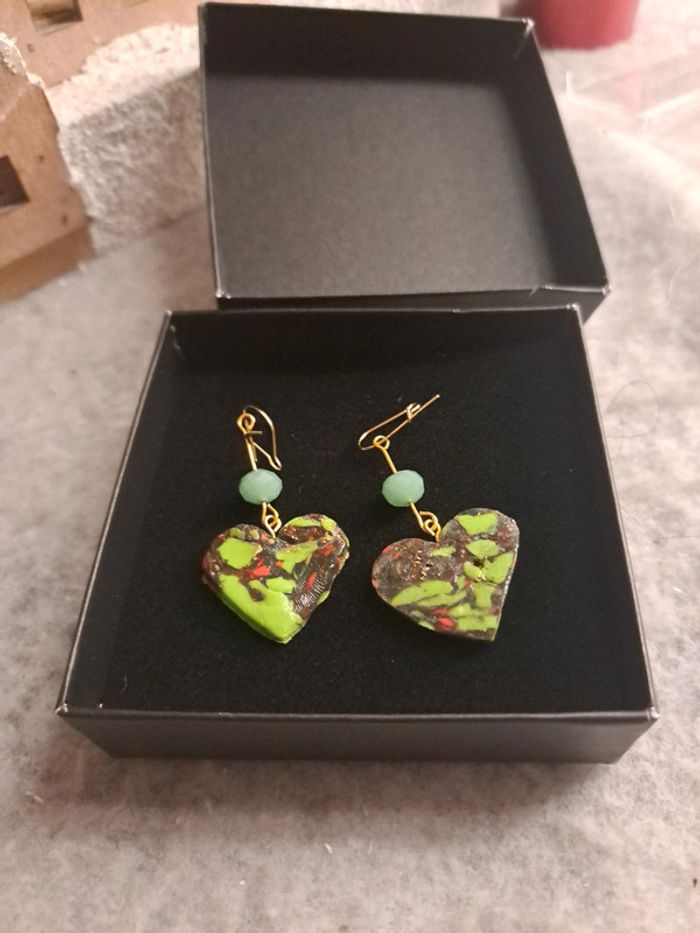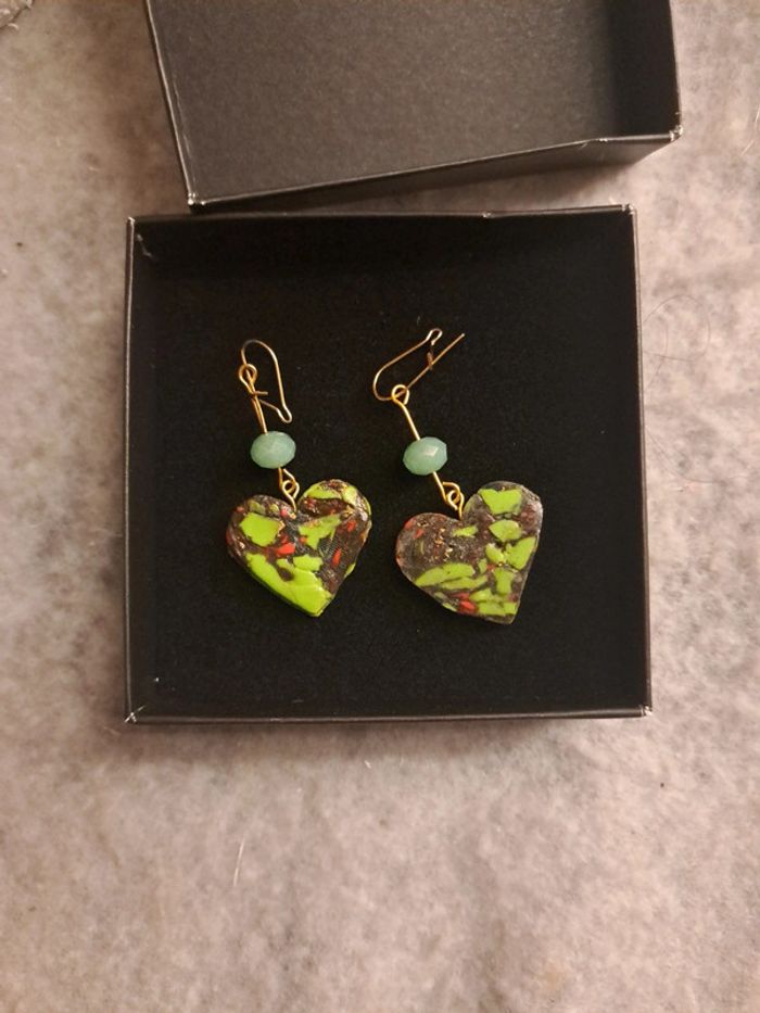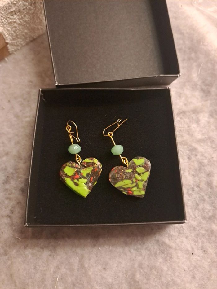 Boucles d'oreilles pendante avec pâte polymere multicolore dominance de verre forme cœur dans sa boîte Bohème