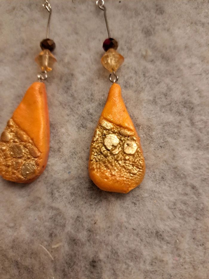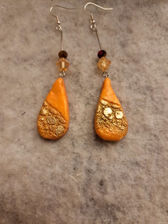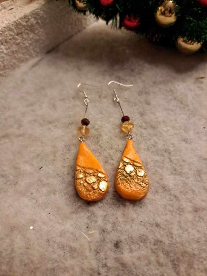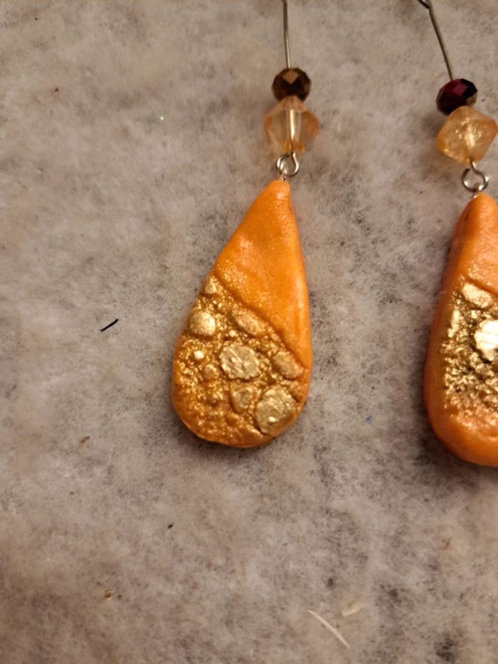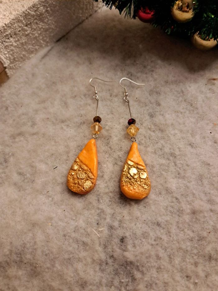 Boucles d'oreilles pendante avec pâte polymere orange poudre doré forme gouttes bohème