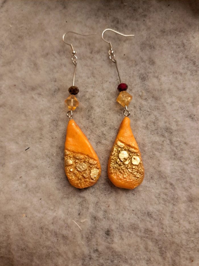 Boucles d'oreilles pendante orange et doré - photo numéro 1