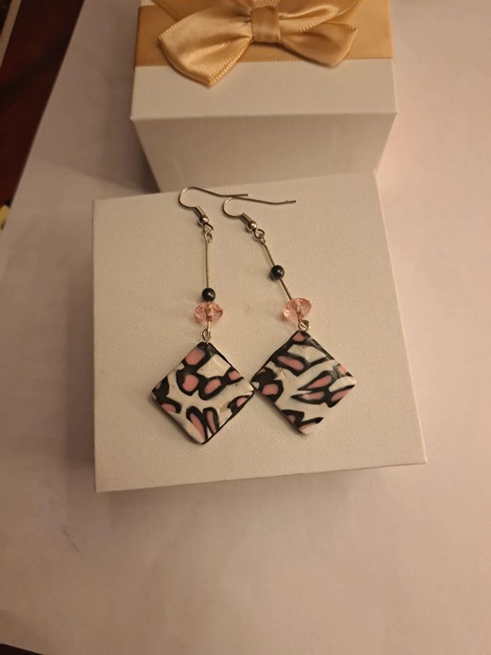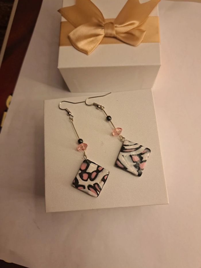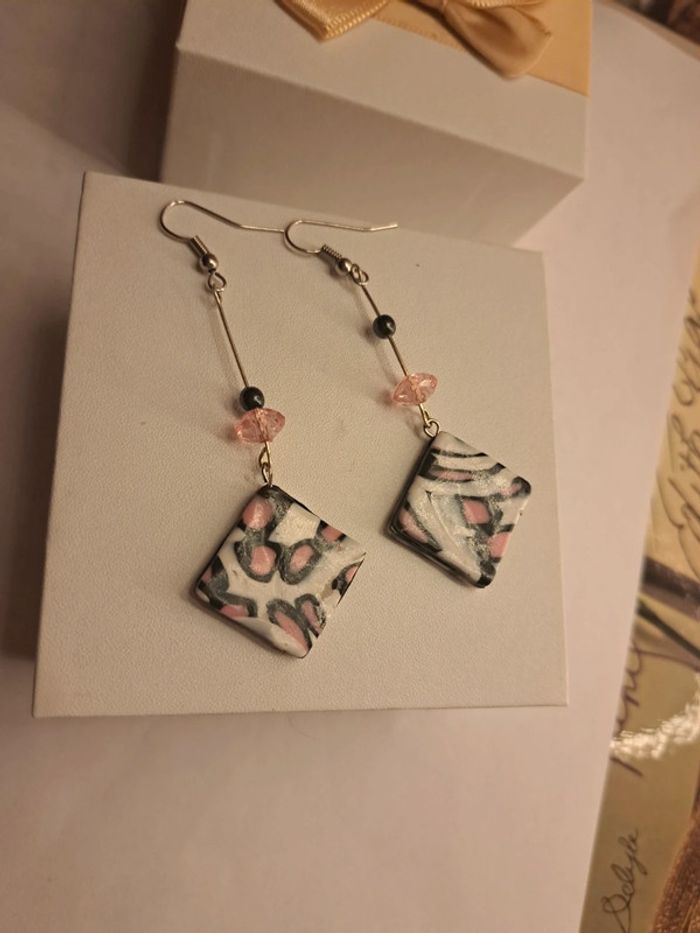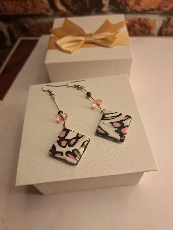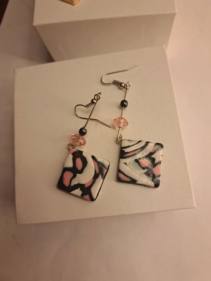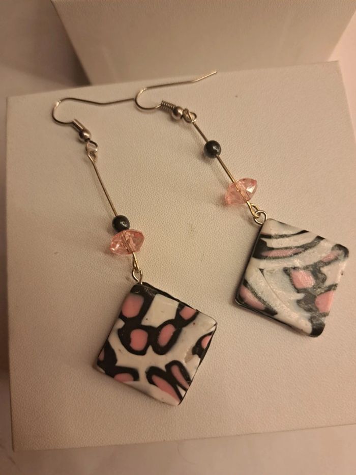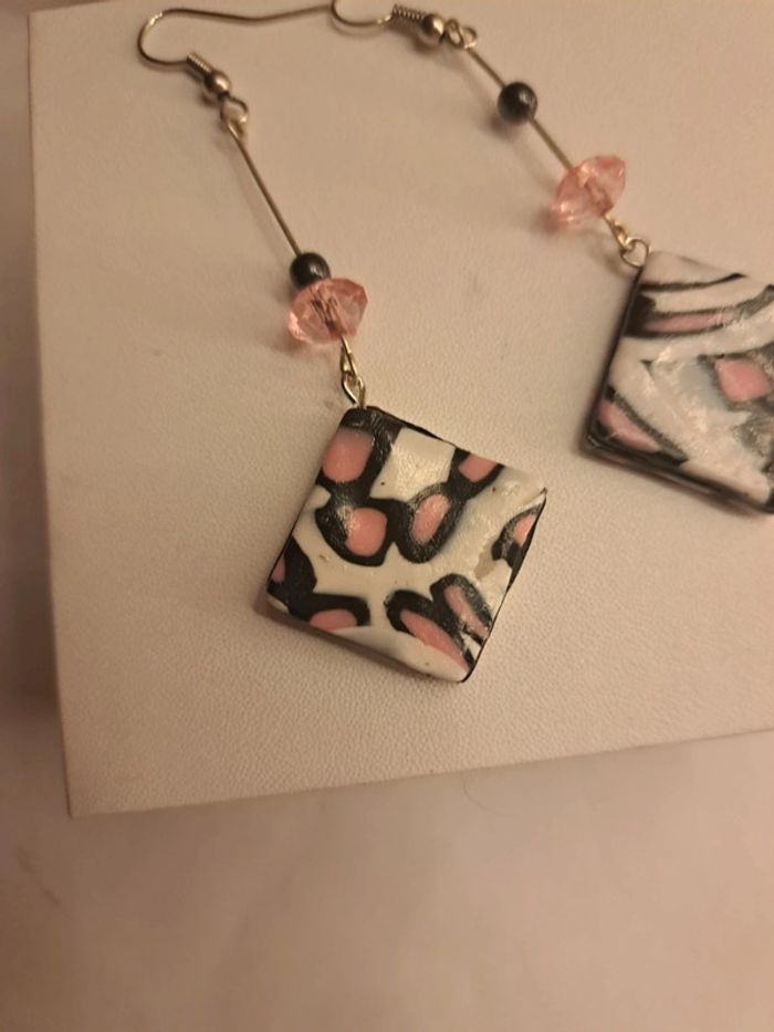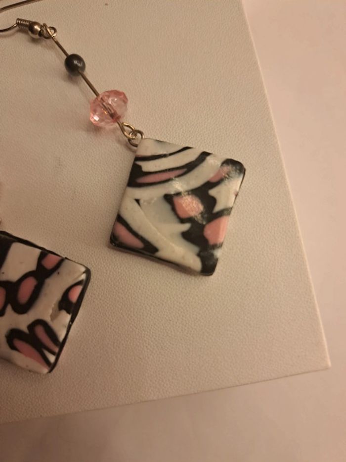 Boucles d'oreilles pendante avec pâte polymere blanche noir et rose avec perles rose écrasée petite perles noir Original
