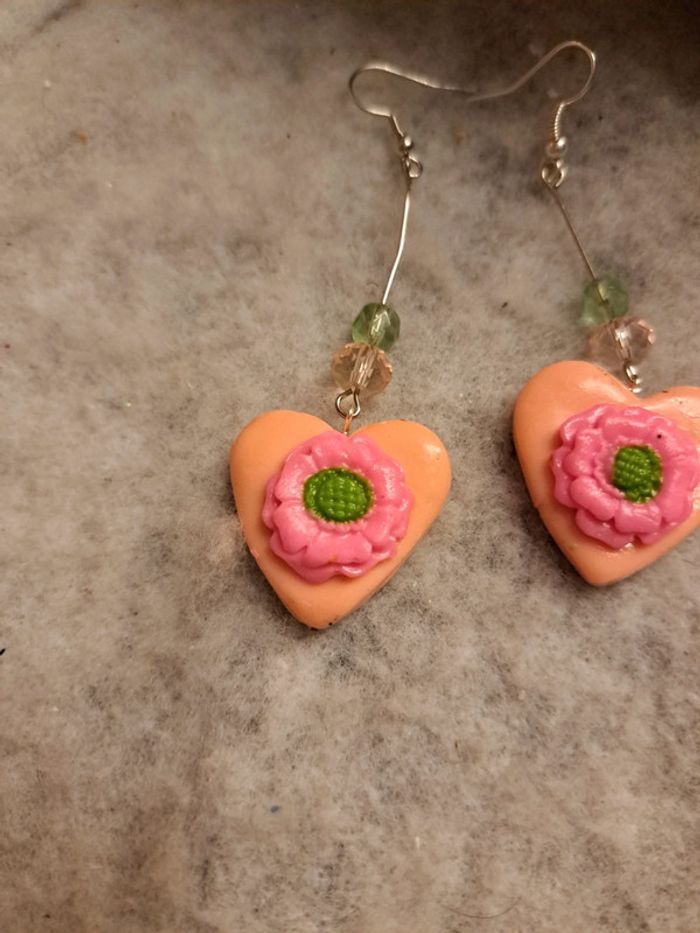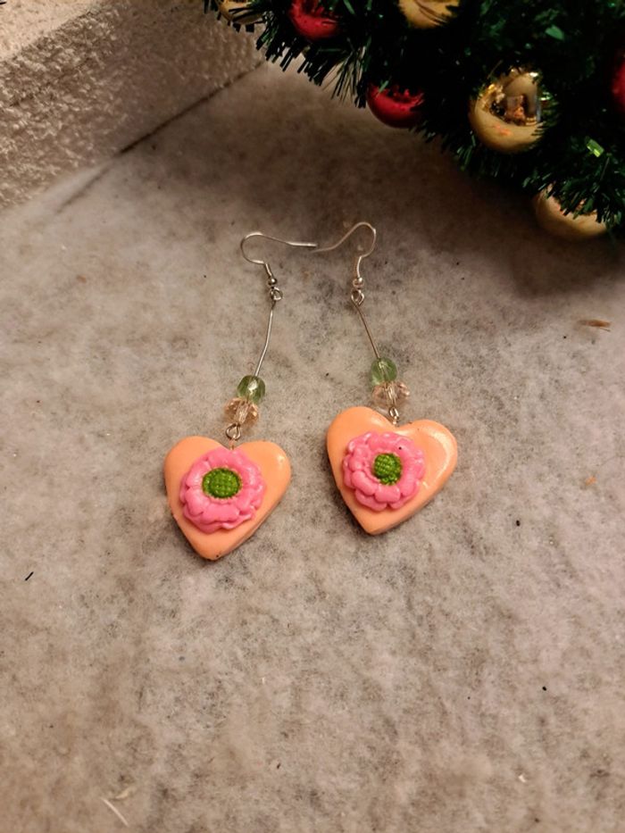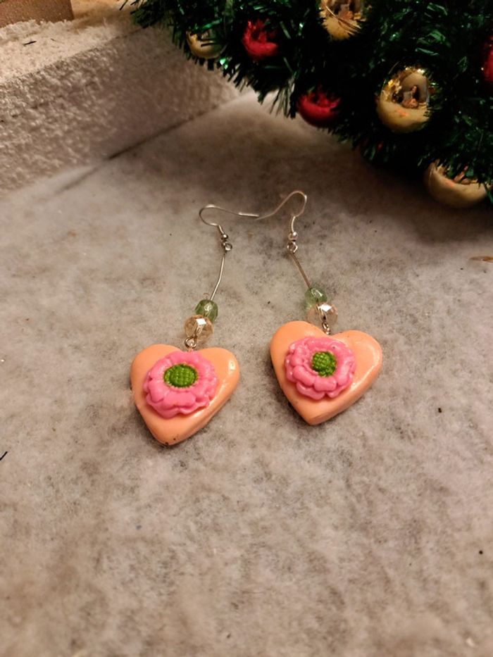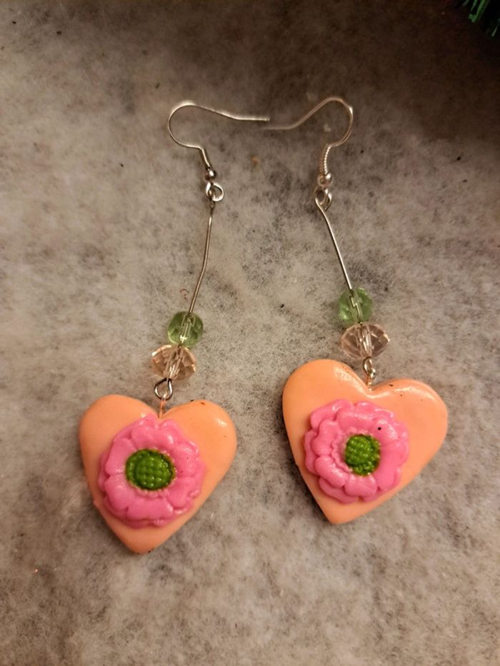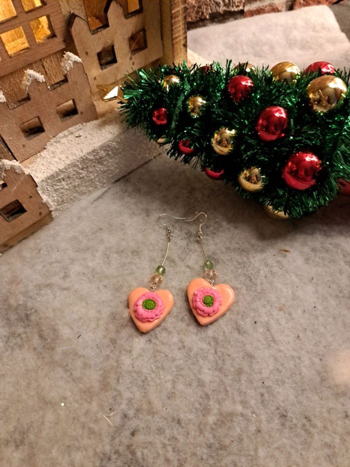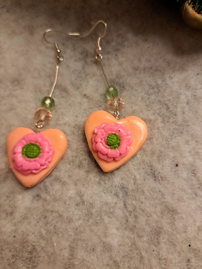 Boucles d'oreilles pendante avec pâte polymere saumon rose et vert forme cœur perles Bohème en verre Champêtre bohème