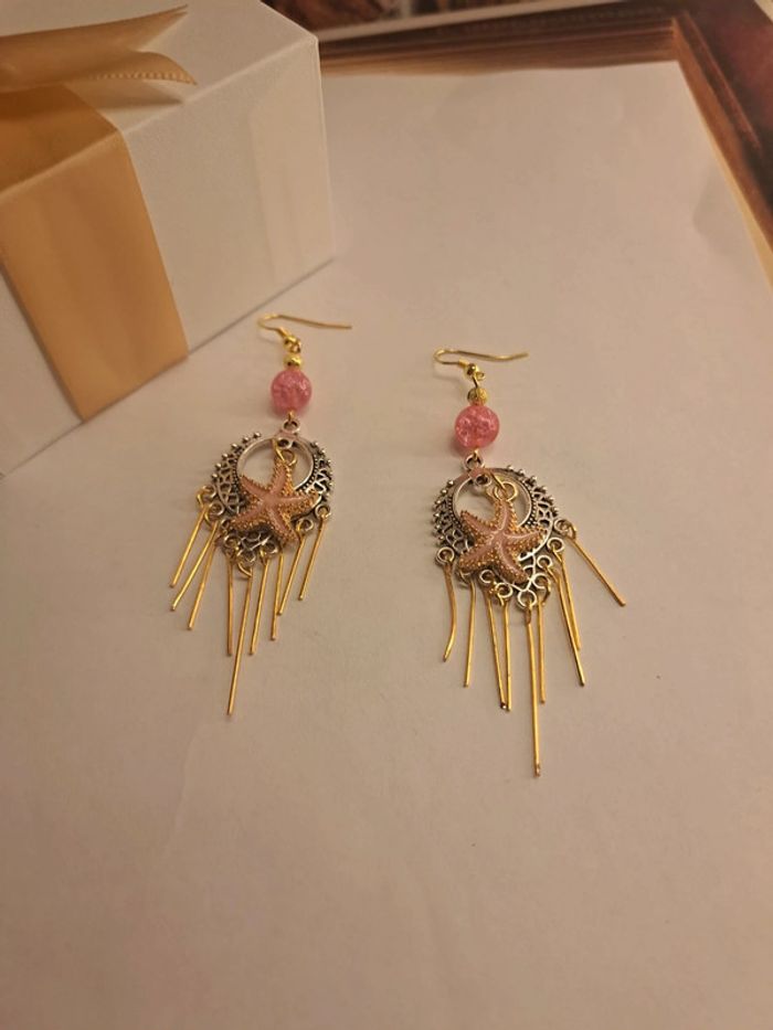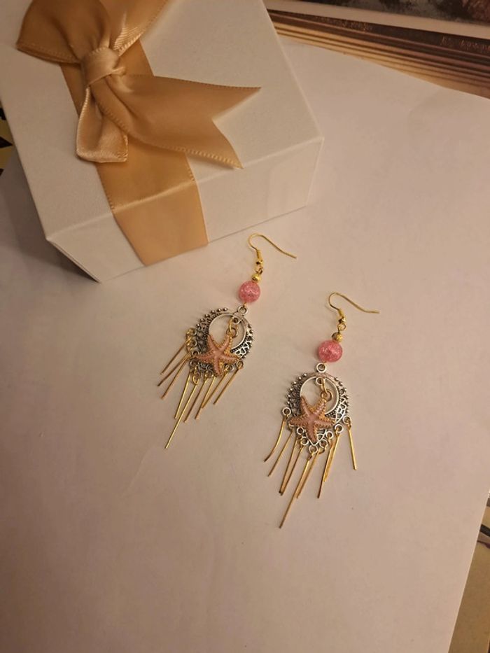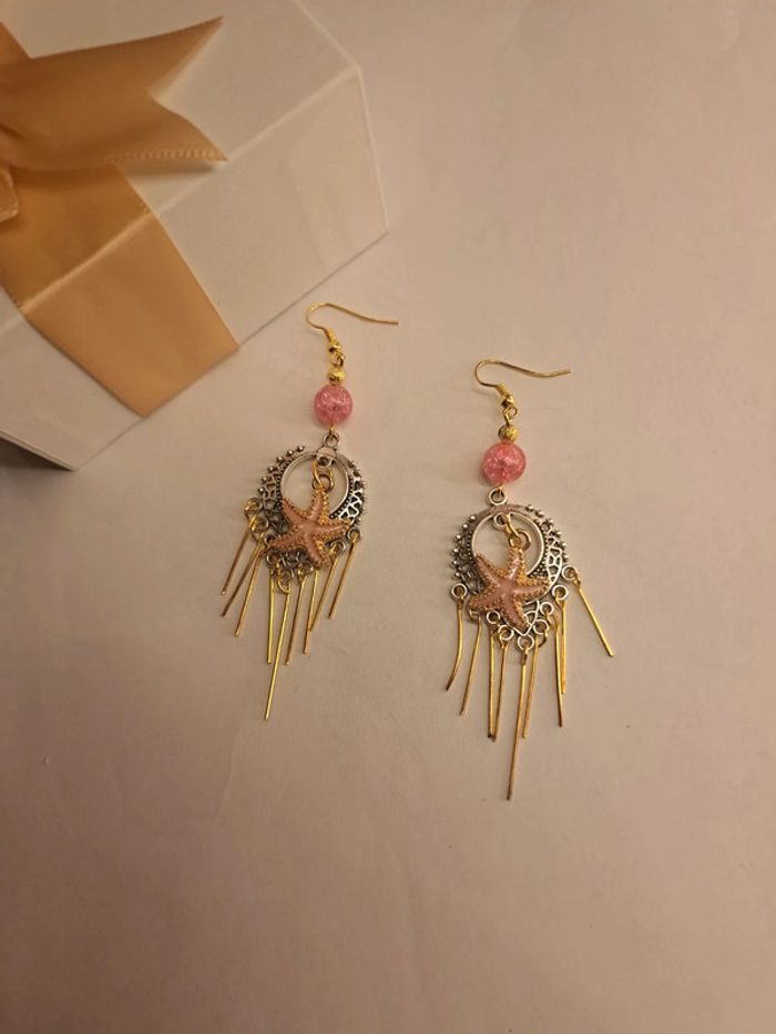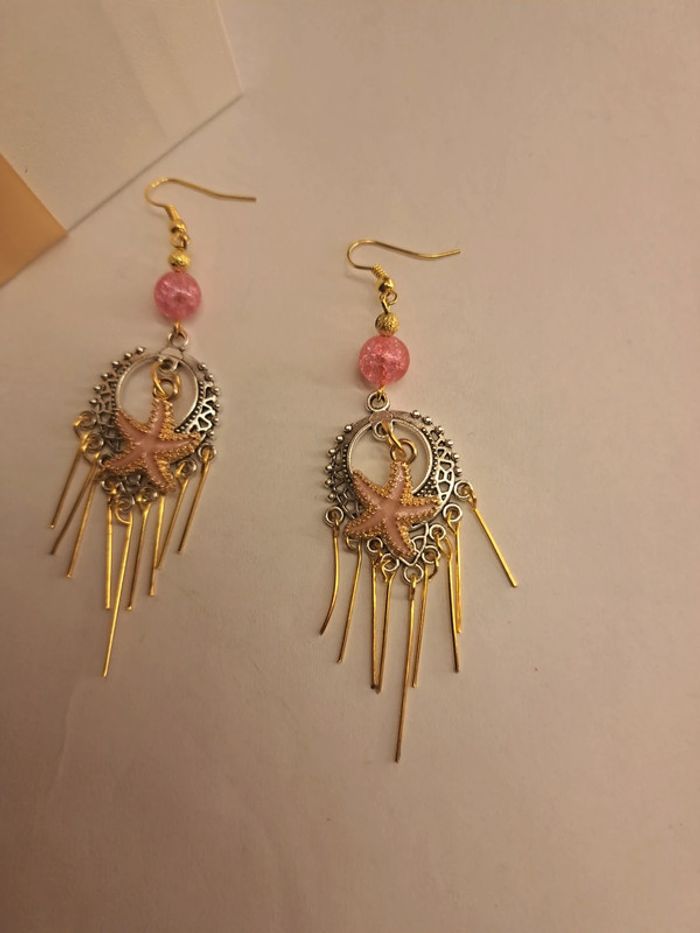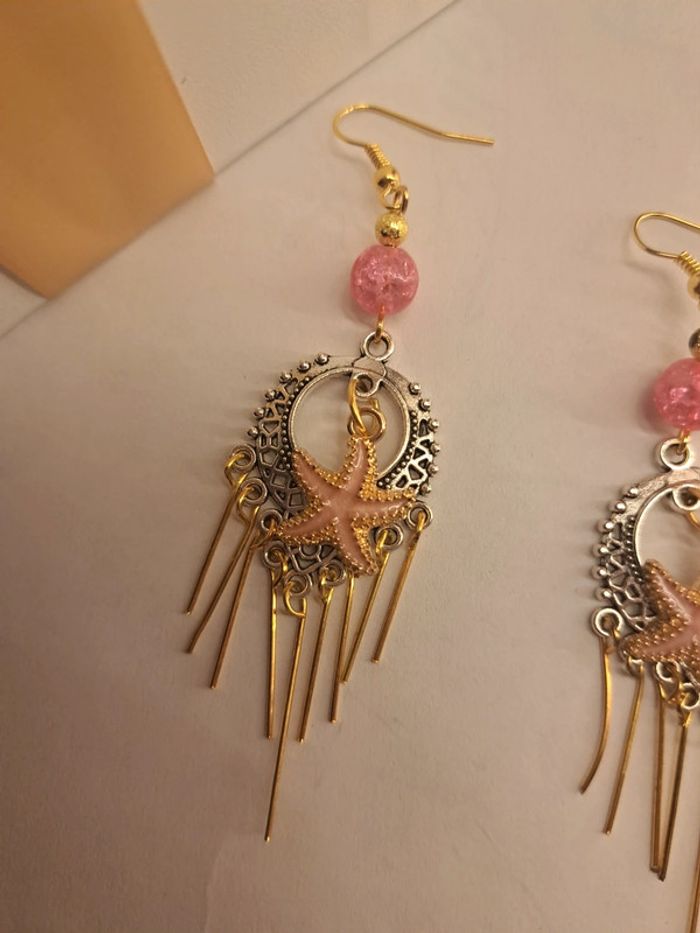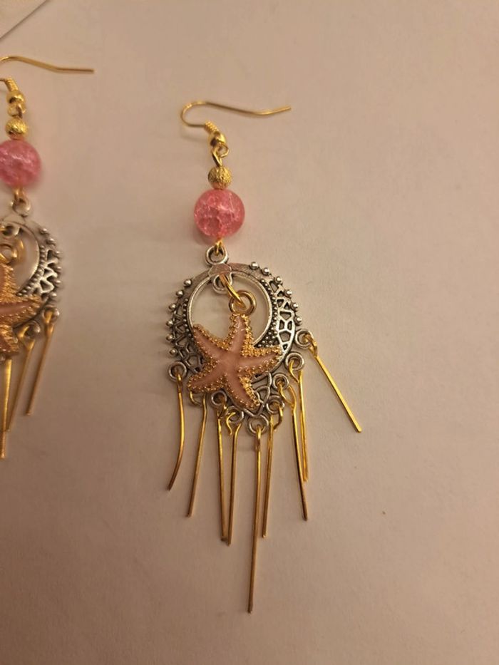 Boucles d'oreilles pendante style bohémienne argenté acier inoxydable avec breloques étoile 🌟 de mer rose et doré tiges doré et perles rose avec petite perles doré Style bohémienne