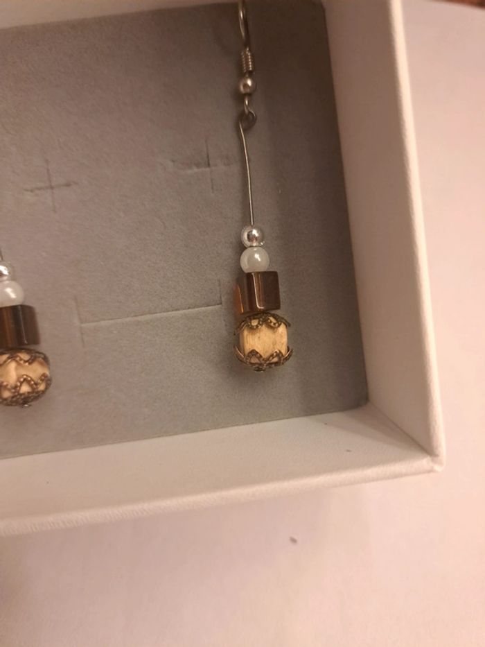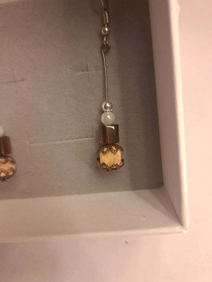 Boucles d'oreilles pendante marron beige blanc et argenté - photo numéro 4