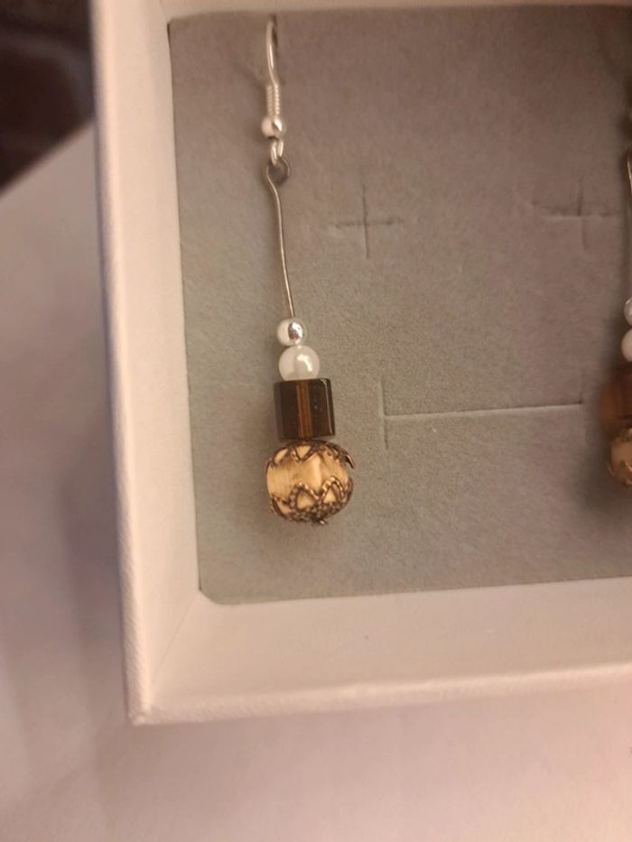 Boucles d'oreilles pendante marron beige blanc et argenté - photo numéro 8