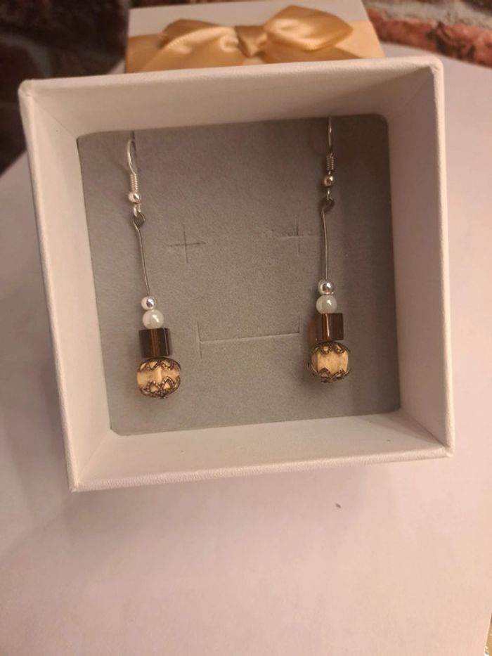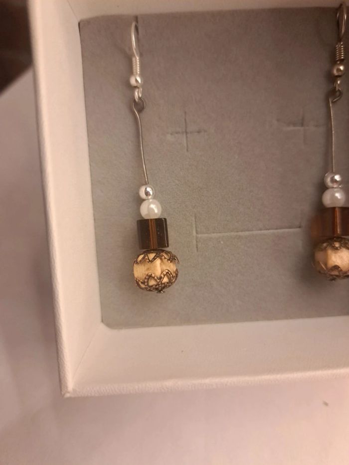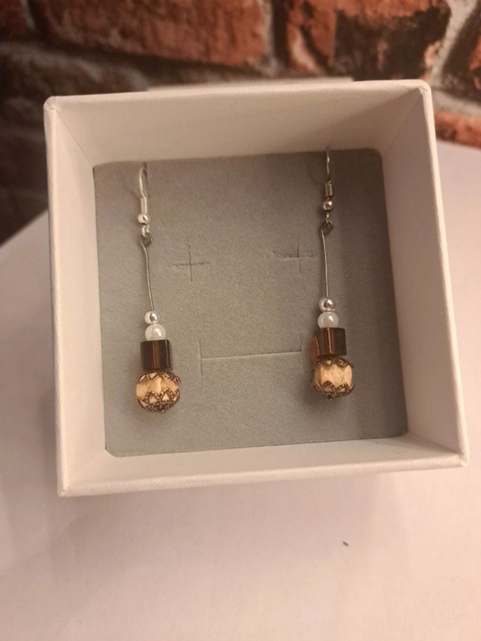 Boucles d'oreilles pendante marron beige blanc et argenté - photo numéro 3