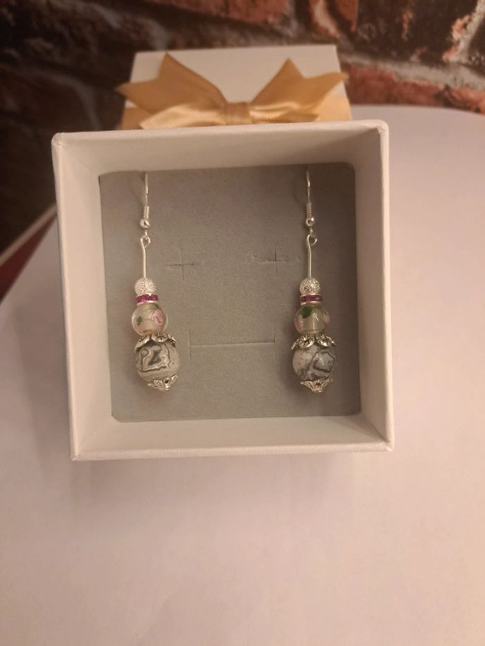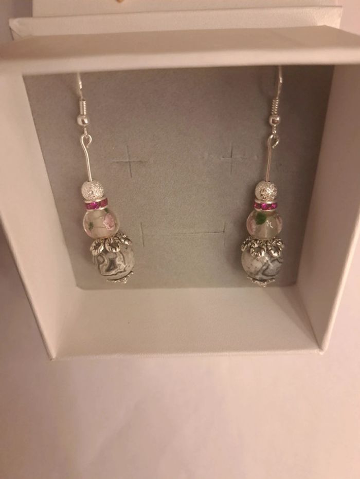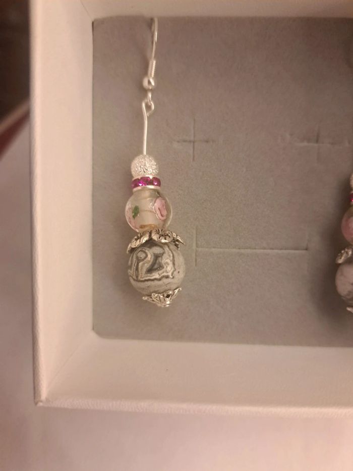 Boucles d'oreilles pendante avec perles grise marbré avec perles en verre petites roses rondelles strass rose fushia et perles argenté avec coupelle argenté Chic élégant petits côté vintage