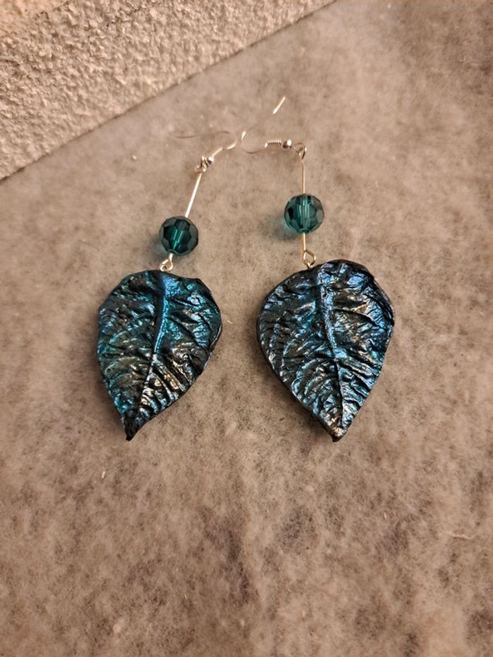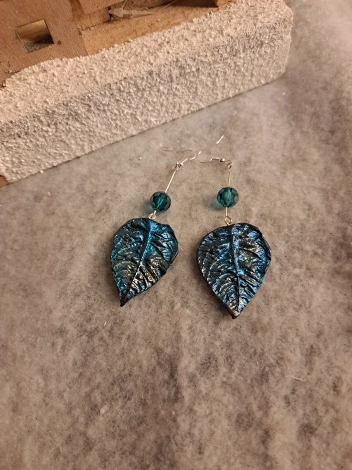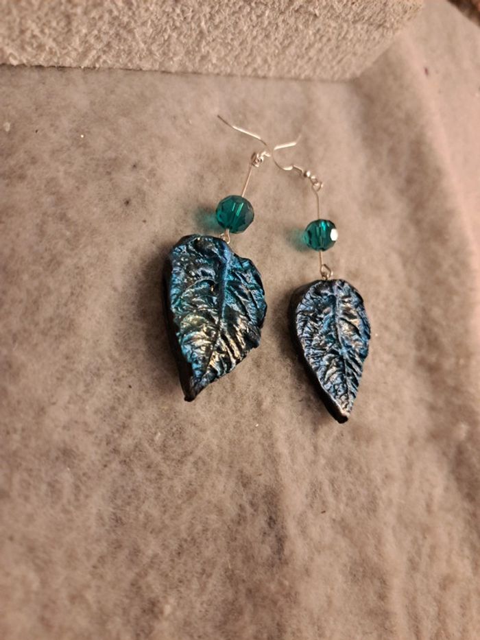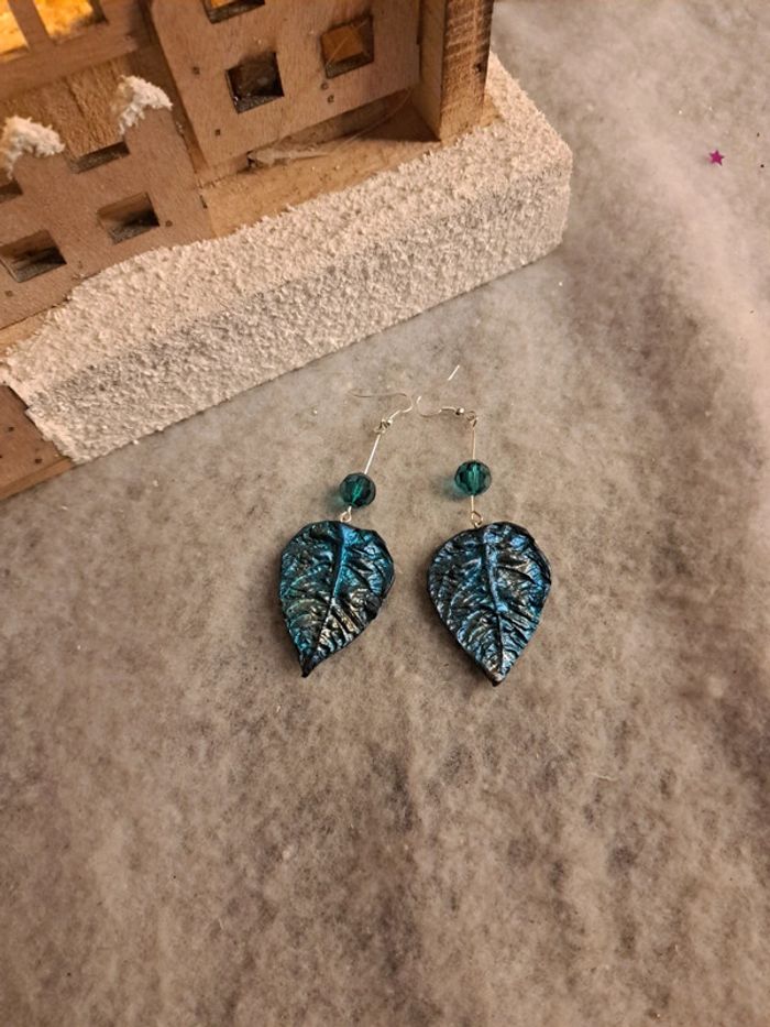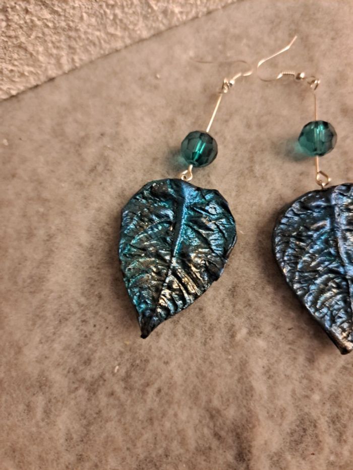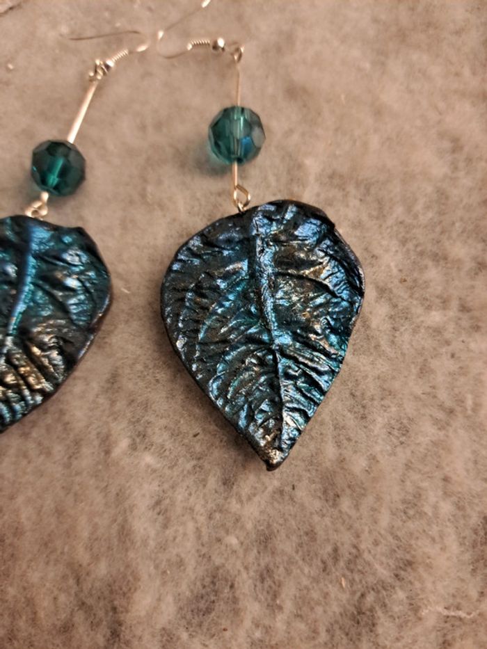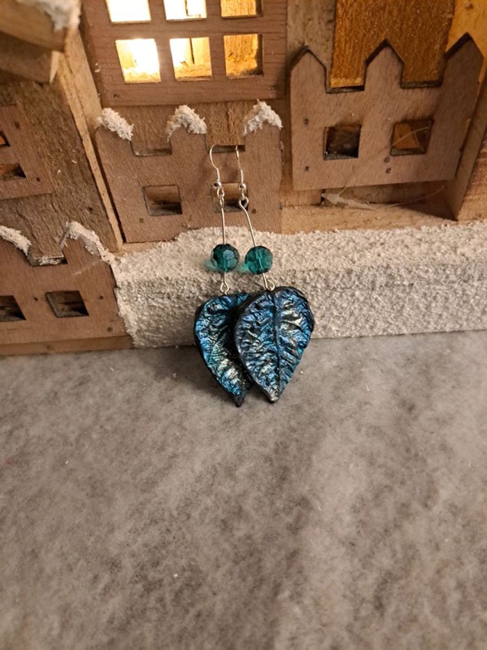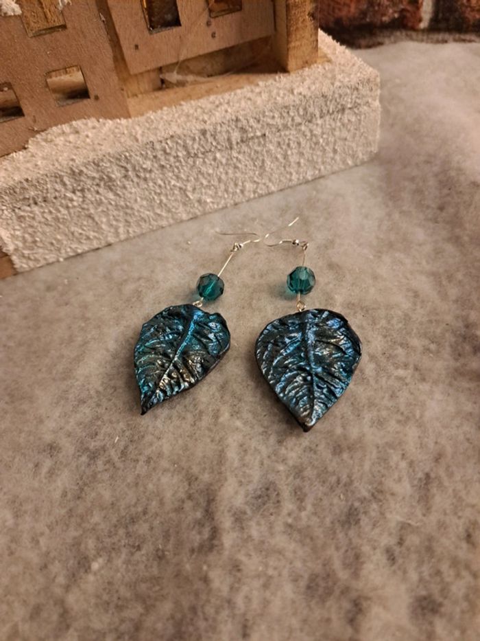 Boucles d'oreilles pendante feuilles bleus métal pâte polymere - photo numéro 9