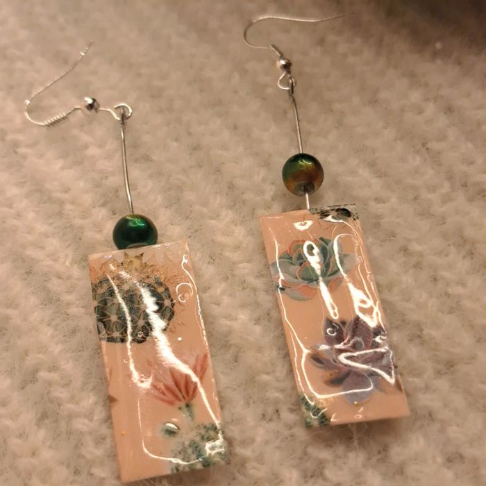 Boucles d'oreilles pendante rectangulaire avec papier florale multicolore avec couches résines Légère
