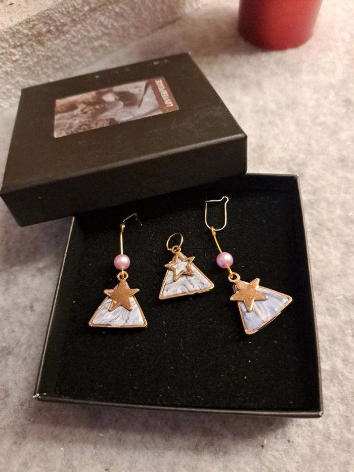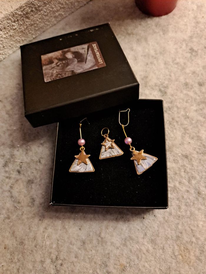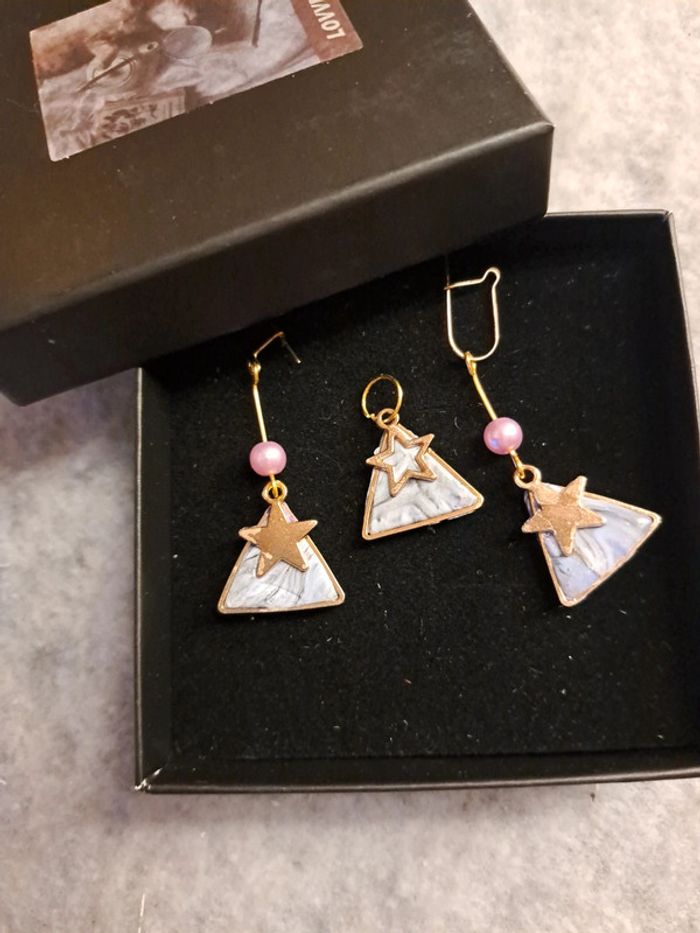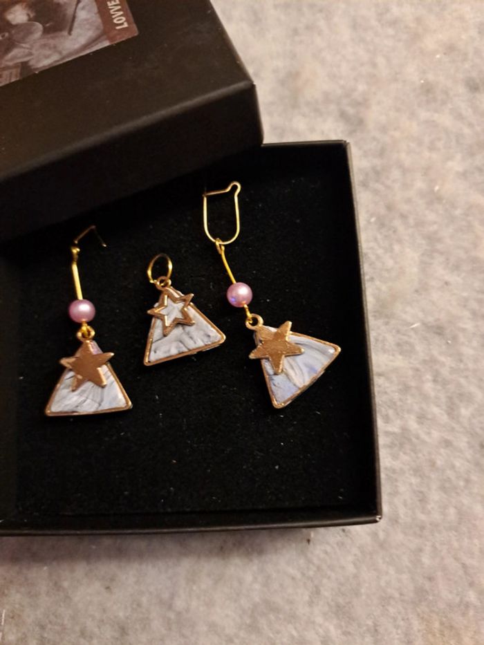 Boucles d'oreilles pendante avec pendentif assortie pâte polymere violet rose forme triangle doré petite étoile 🌟 doré Bohème