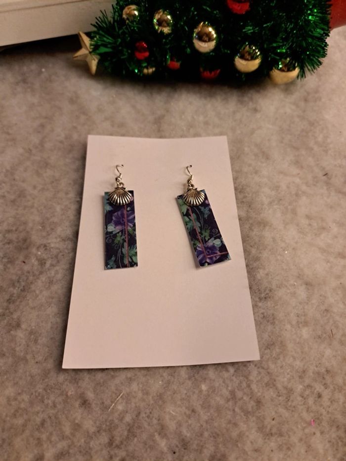 Boucles d'oreilles pendante en résine avec inclusion papier florale violet vert rectangulaire légère