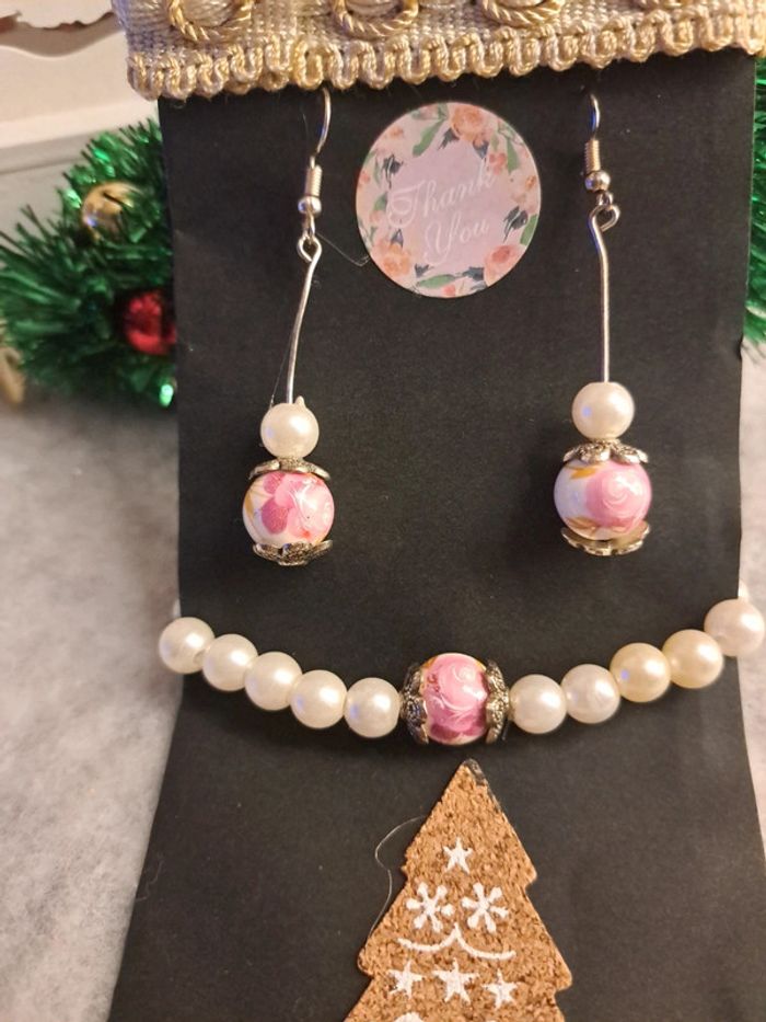 Boucles d'oreilles pendante avec bracelet rose et blanc