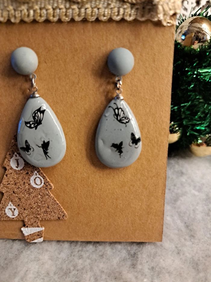 Boucles d'oreilles pendante grise forme gouttes avec stickers fée et papillon 🦋 noir Petit côté bohème
