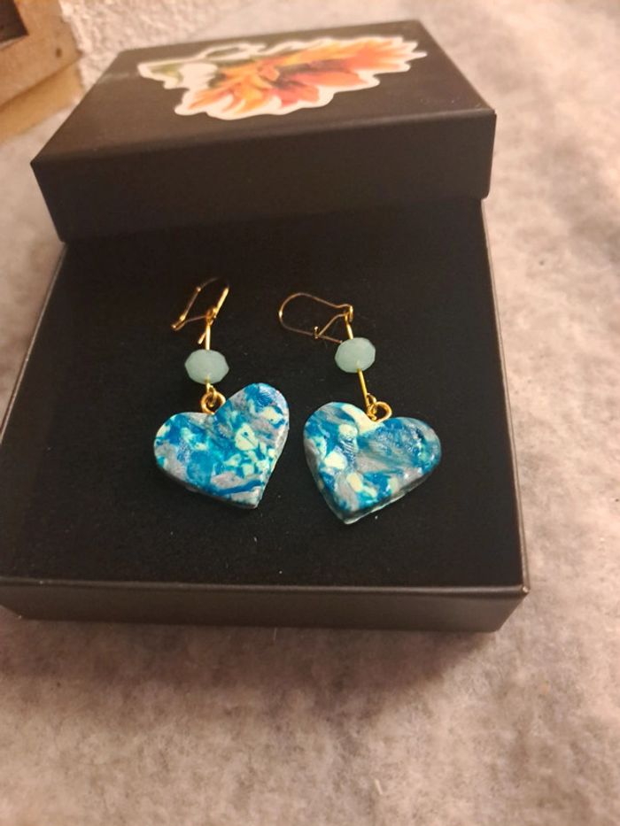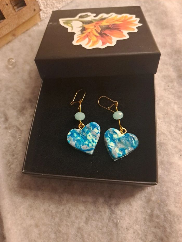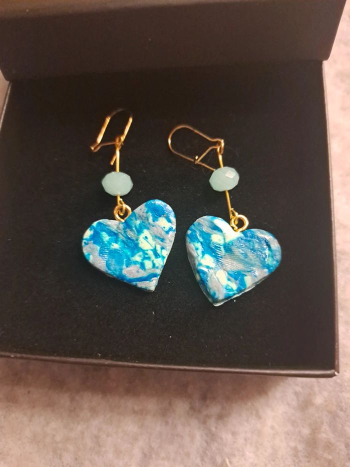 Boucles d'oreilles pendante avec pâte polymere Bleu et gris forme cœur Bohème