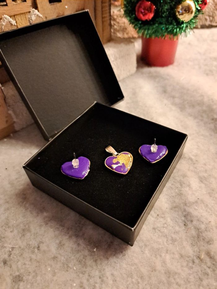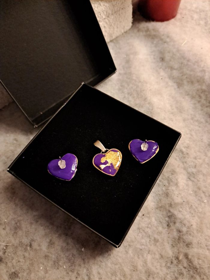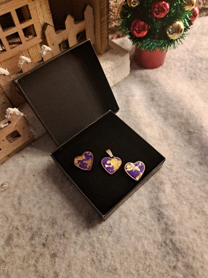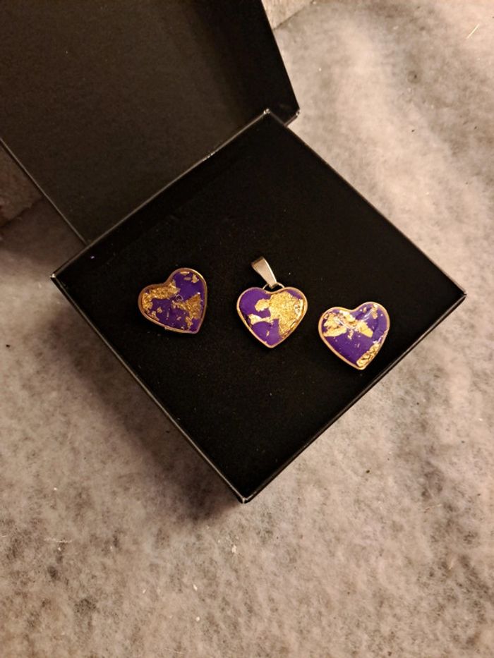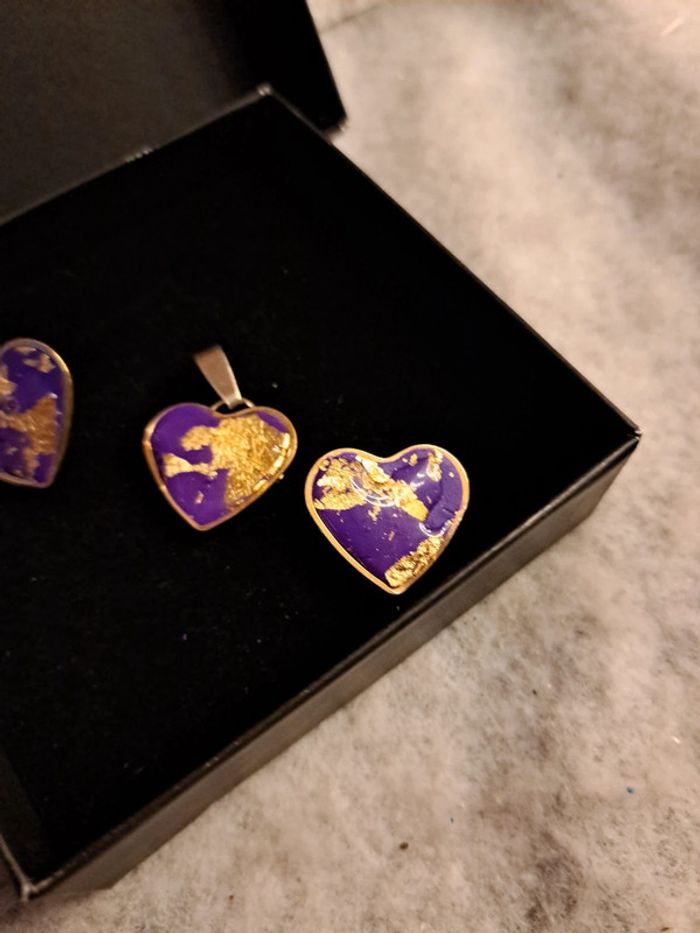 Boucles d'oreilles cœur doré avec pendentif assortie violet et rose pâte polymere et feuilles d'or couche de résine Bohème
