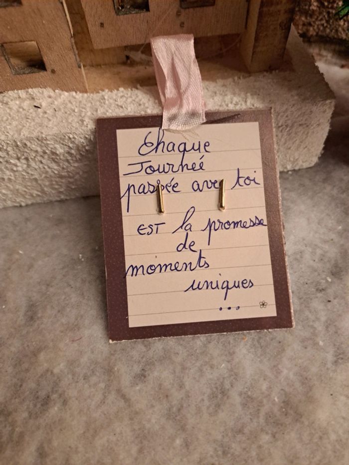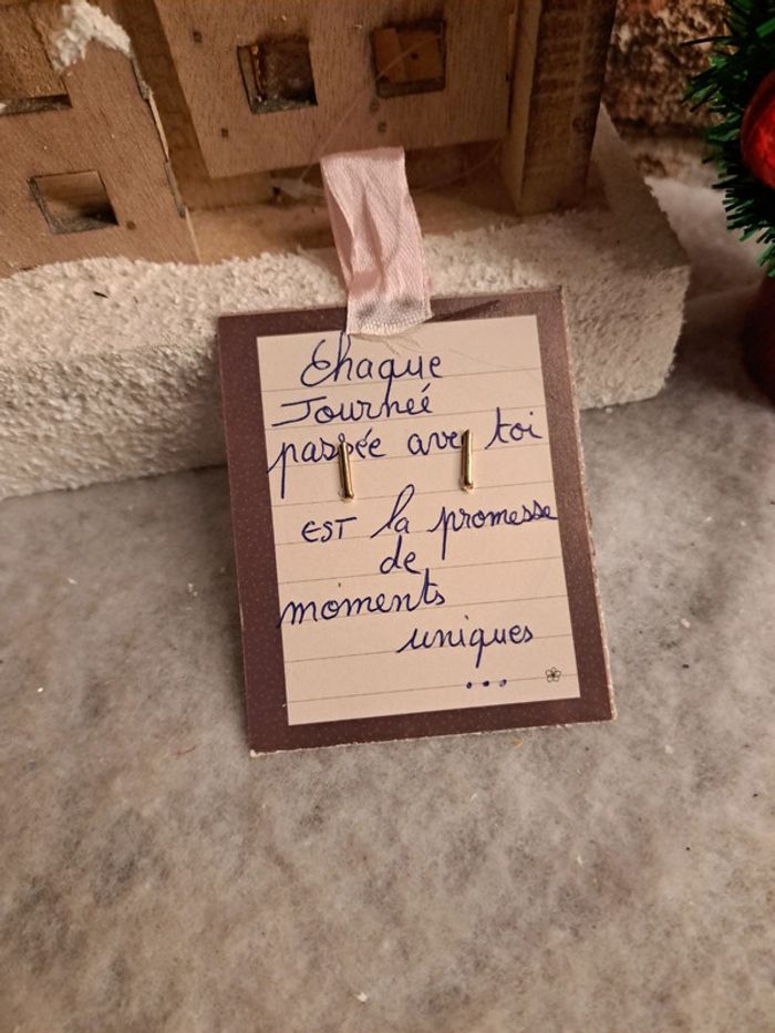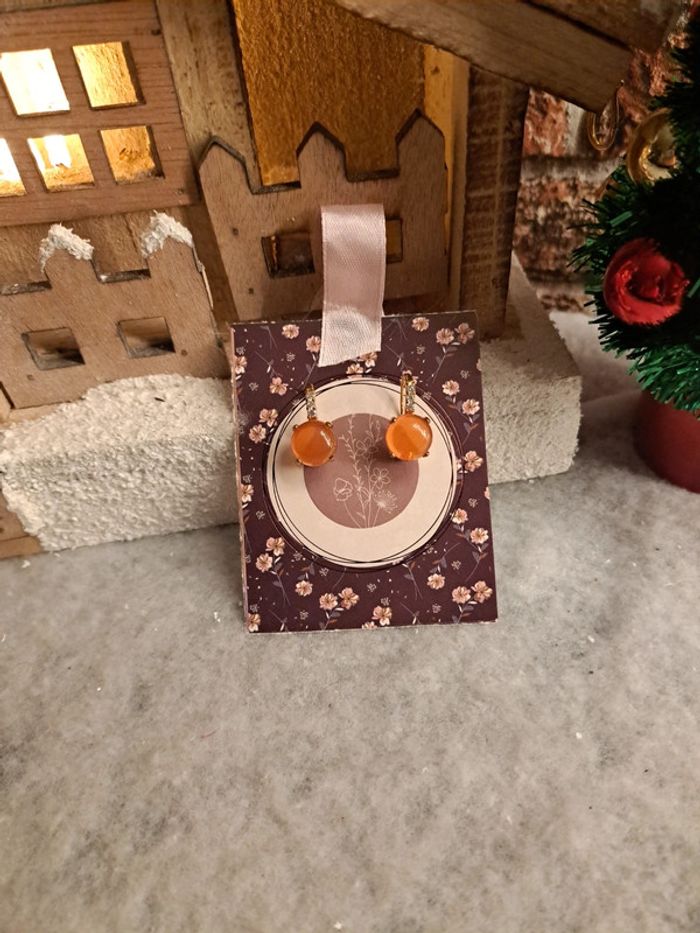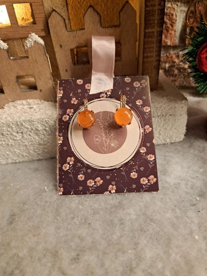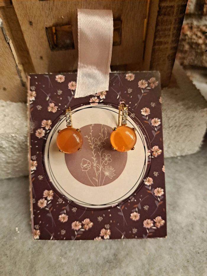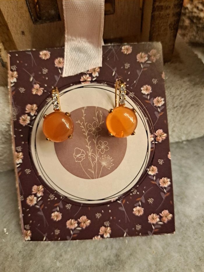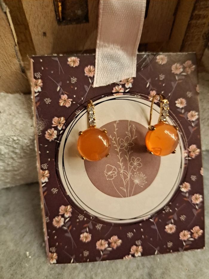 Boucles d'oreilles pendante orange avec strass blanc dore chic élégant avec petit texte derrière le dos A offrir